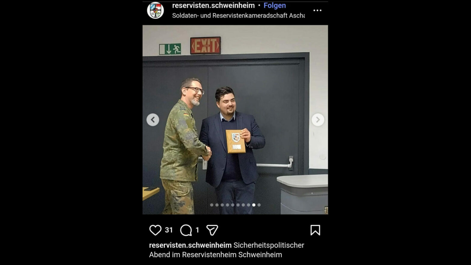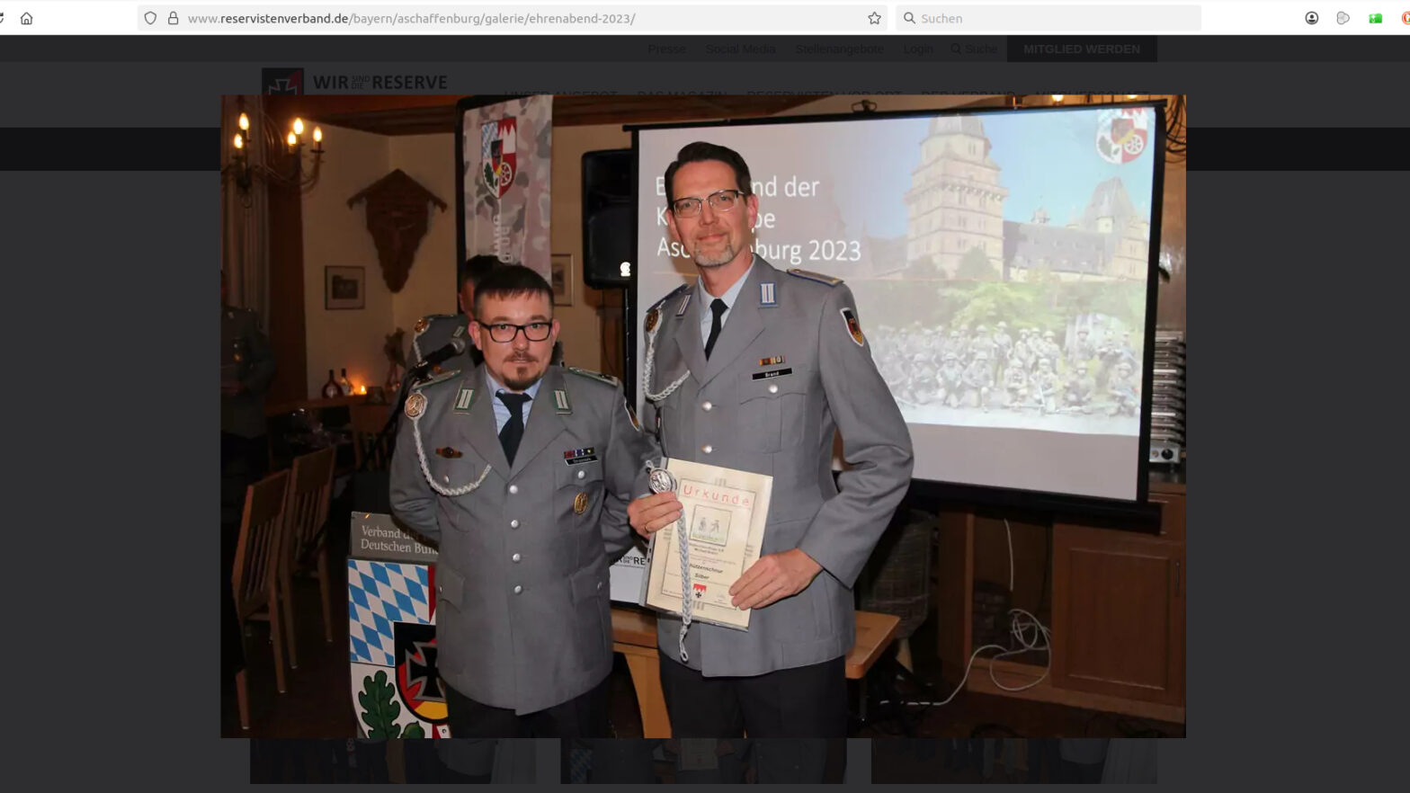 Der derzeitigen politischen Agenda folgend suchen zahlreiche Volksvertreter*innen demonstrativ die Nähe zur »Parlamentsarmee Bundeswehr« und/oder werden Mitglied in einem Reservistenverband. So auch der aufstrebende Bundestagsabgeordnete Niklas Wagener, Mitglied der Grünen in Aschaffenburg, ehemaliger Klimaaktivist und heute Mitglied im Verteidigungsausschuss des Bundestags. Er wurde im Oktober 2025, im Anschluss an einen »Sicherheitspolitischen Abend« als Mitglied der Reservistenkameradschaft Aschaffenburg-Schweinheim aufgenommen. Dazu gratulierte ihm Michael Brand persönlich.