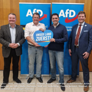 Am 27.11.2025 hielt die AfD ihren letzten Stammtisch ab. Zu Gast war der EU-Abgeordnete Marc Jongen. Dieser vertritt innerhalb der AfD völkische Positionen, sympathisiert mit der Identitären Bewegung und möchte „traditionelle Familienstrukturen“ und eine „deutsche Nationalkultur“ erhalten, welche von einem „Amoklauf der Moderne“ bedroht seien. 2017 rief er zur „zivilen Wehrhaftigkeit“ gegen die angebliche „Invasion“ von Migrant*innen auf. Beim Stammtisch in Heidelberg habe er von seiner „Arbeit aus dem EU-Parlament“ berichtet.