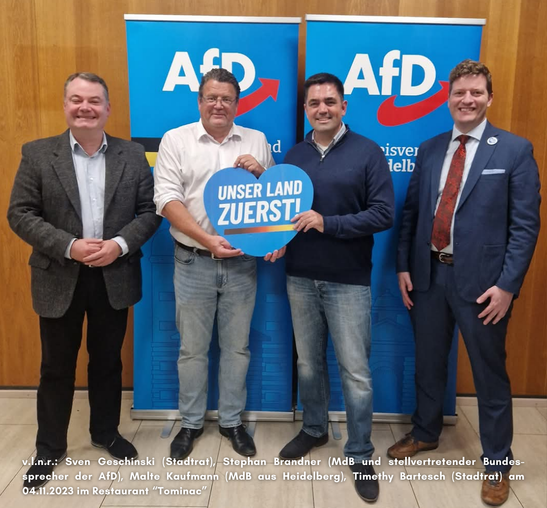 Am 27.11.2025 hielt die AfD ihren letzten Stammtisch ab. Zu Gast war der EU-Abgeordnete Marc Jongen. Dieser vertritt innerhalb der AfD völkische Positionen, sympathisiert mit der Identitären Bewegung und möchte „traditionelle Familienstrukturen“ und eine „deutsche Nationalkultur“ erhalten, welche von einem „Amoklauf der Moderne“ bedroht seien. 2017 rief er zur „zivilen Wehrhaftigkeit“ gegen die angebliche „Invasion“ von Migrant*innen auf. Beim Stammtisch in Heidelberg habe er von seiner „Arbeit aus dem EU-Parlament“ berichtet.