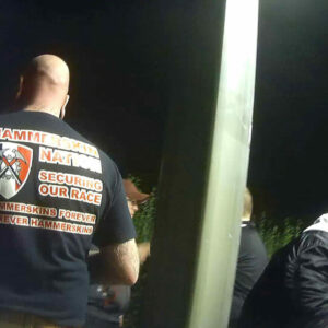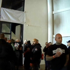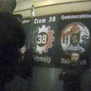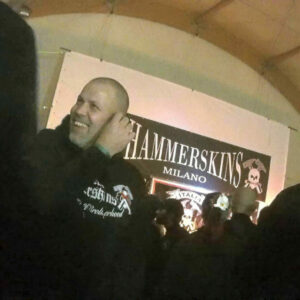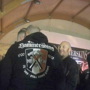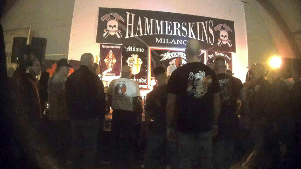 Es ist der 15. November 2025. Ein nasser und grauer Samstagabend in Lonate Pozzolo (Region Varese), nördlich der italienischen Metropole Mailand. Um die 500 Neonazis aus ganz Europa und darüber hinaus finden sich in einer Leichtbauhalle ein, um das 30-Jährige Bestehen der «Italia Hammerskins» zu feiern. „Hammerfest“ steht in großen Lettern auf den laminierten Getränkekarten und auf der Preistafel am Imbiss. Fotografieren ist strengstens untersagt. Im Publikum befinden sich etwa 150 Personen, die der «Hammerskin Nation», kurz HSN, angehören. Viele davon zeigen ihre Zugehörigkeit zur „Nation“ durch das Tragen einer uniform-artigen Bomberjacke mitsamt Patches (Aufnäher) ihres Chapters, den regionalen Ablegern der HSN. Die anwesenden deutschen Hammerskins verzichten an diesem Abend allerdings auf diese Uniform. Stattdessen funkelt hier und da ein kleiner Metall-Pin am Kragen der Jacke, der aus zwei gekreuzten Hämmern besteht, die mit einem Zahnrad hinterlegt sind. Wieder andere tragen „nur“ abnehmbare Patches oder Bekleidung, auf der der Schriftzug „Hammerskins“ oder die „Crossed Hammers“ zu sehen sind, dem Organisationszeichen der HSN.