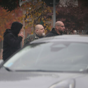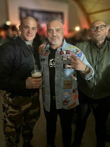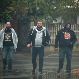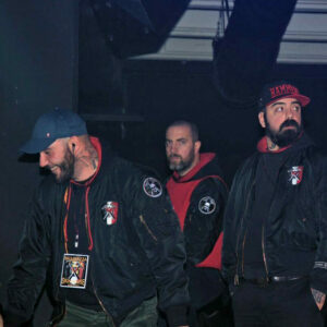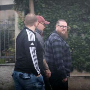 Die ungarischen Hammerskins Zoltan Papp (Vordergrund), Krisztian Szlavecz (links hinter Papp) und Imre Mészei (rechts von Papp) am Einlass des „Hammerfest“ 2025 in Italien – Bildrechte: Exif-Recherche