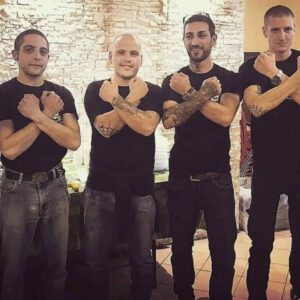 Aufstellung der IHS um 2020: Stefano Ghezzi, Sergio Ciccolella, Emanuele Bisogni, „Marco“, Guiseppe Locatelli. Alessandro Liburdi, Antonio Radaelli, Simone Simonetti, Erminio Rigamonti, Marco Garibaldi, Luca Gigliotti, Riccardo Colato, Davide Cancelli, Emanuele di Bari, Stefano del Miglio, mutmaßlich del Miglios Partnerin, Marco Coppola , Andrea Bossi, Mirko Tedesco, Vito Schirone, Pietro Caruso, Paolo Severgnini, Giacomo Pedrazzoli, der Mafiosi Domenico Bosa, Filippo Moroni und „Ciano“ (v.l.n.r.) – Screenshot Instagram