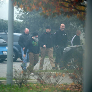 Die französischen Hammerskins David Strozza (1.v.l.) und Christophe Saccavini (2.v.l.), mit einem unbekannten Hammerskin vom Chapter «North France», sowie Yoan Voignier von der «Crew 38 North France», auf dem Weg zum EOM am Nachmittag des „Hammerfest“ 2025 in Italien – Bildrechte: Exif-Recherche
