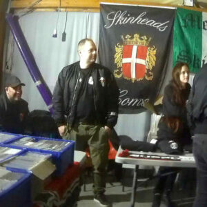 Die Durchführung des „Hammerfest“ im November 2025 wäre sicherlich nicht möglich gewesen, hätte es nicht zahlreiche helfende Hände gegeben. Neben den italienischen Hammerskins, ihrer «Crew 38» und befreundeten Gruppen, waren besonders Hammerskins aus der Schweiz in die Organisation eingebunden. Dass das Banner des Schweizer Ablegers der Bruderschaft auf der Bühne angebracht war, bekräftigt die Rolle. So waren neben dem deutschen Hammerskin Thomas Irion, die Schweizer „Brüder“ Gaël Renevey, Reto Wäckerlig und David Nagel im Sicherheitsdienst tätig. Nagel war namentlich bislang nicht als Hammerskin bekannt. Der in Bischoffszell (Kanton Thurgau) wohnhafte und bei der Firma Otis in Oberbüren (Kanton Sankt Gallen) tätige Nagel, fiel allerdings bereits 2019 auf dem „Hammerfest“ in Italien in Fullmember-Kluft auf. Im November 2025 in Italien anwesend waren zudem die langjährig aktiven Schweizer Hammerskins Florian Gerber, Marco Gaggioli und Michael Kunz. Kunz’ Partnerin Jasmin Marfurt betreute mit Luana Mannai, wie schon 2019 auf dem „Hammerfest“, den Verkaufsstand der «Crew 38», der die beiden viele Jahre angehören. Der Stand reihte sich im November 2025 ein in eine sehr übersichtliche Verkaufsfläche. Neben einem weiteren Stand eines italienischen RechtsRock-Labels, war noch das ungarische Neonazi-Label «Nordic Sun Records Budapest» mit einem Stand vertreten. Dort konnten auch Aufnäher mit Hakenkreuz-Emblemen wie auch mit dem Schriftzug «Blood & Honour» erworben werden.