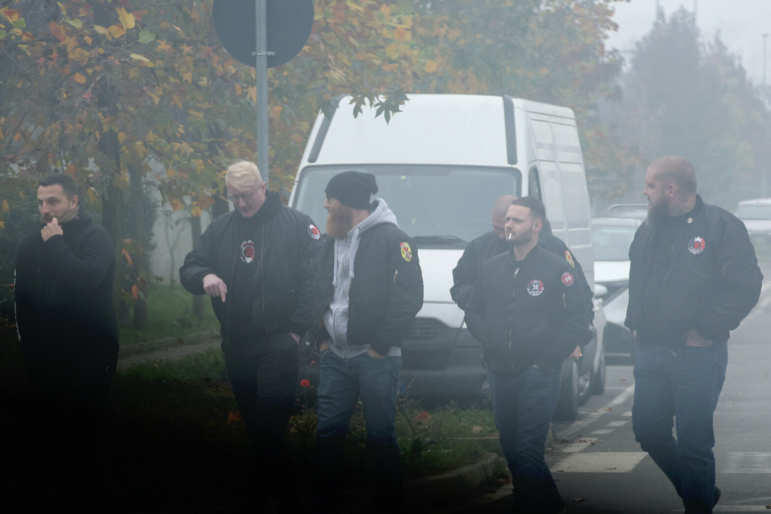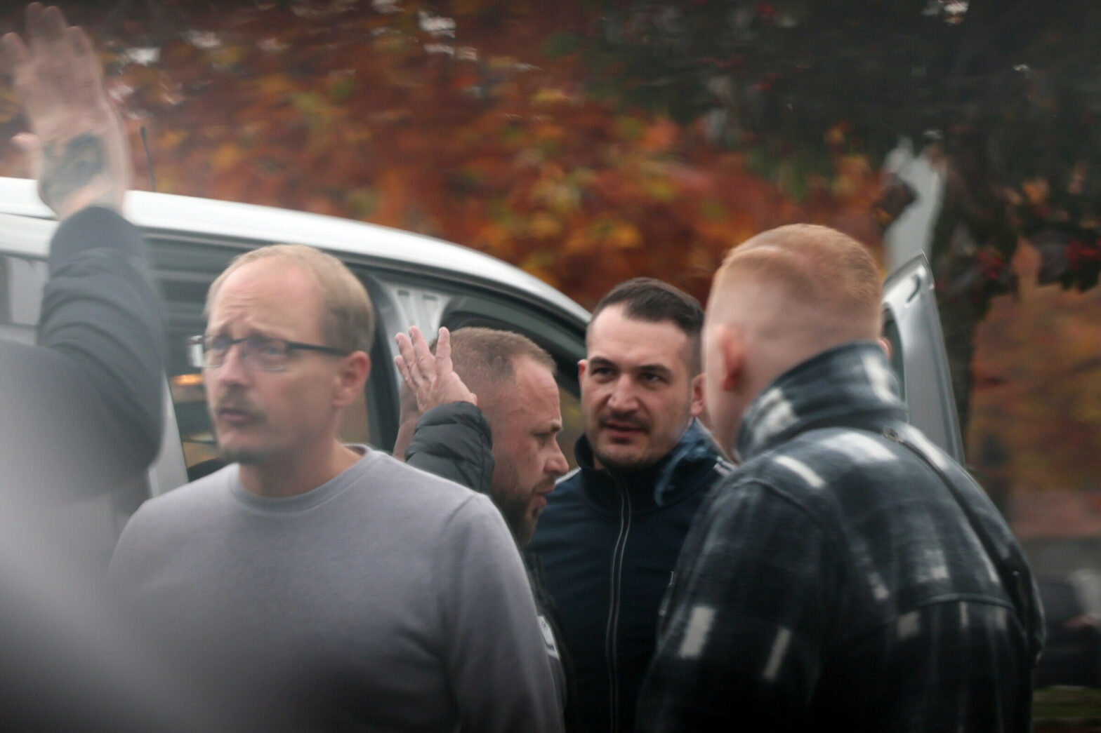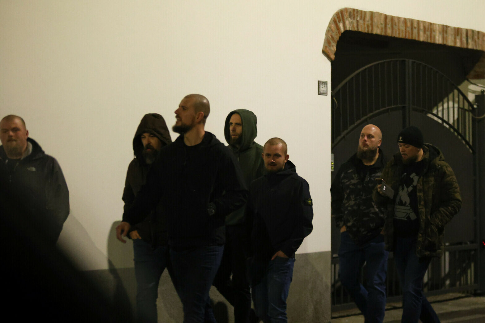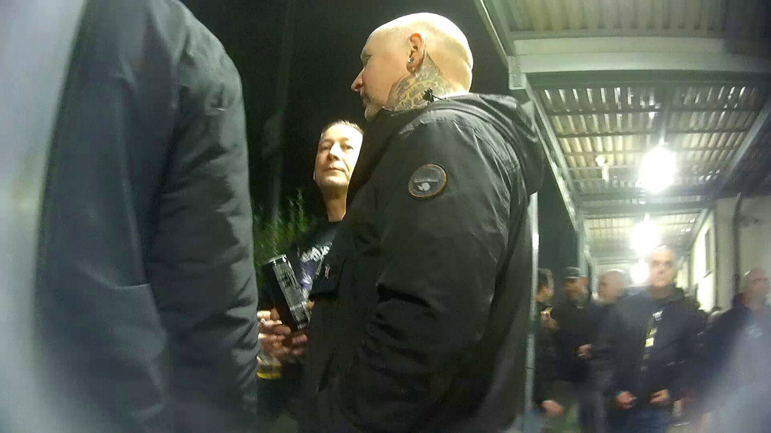Die ungarischen Hammerskins Zoltan Papp (Vordergrund), Krisztian Szlavecz (links hinter Papp) und Imre Mészei (rechts von Papp) am Einlass des „Hammerfest“ 2025 in Italien – Bildrechte: Exif-Recherche