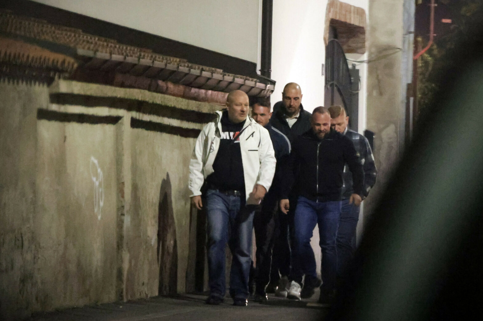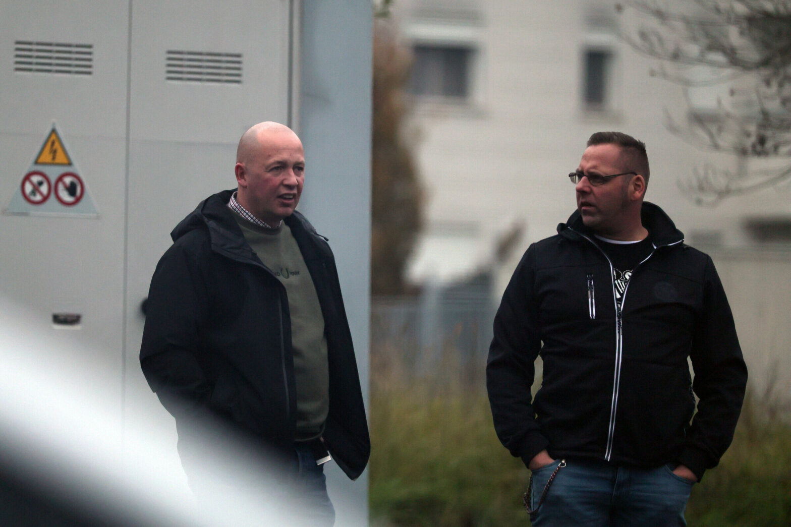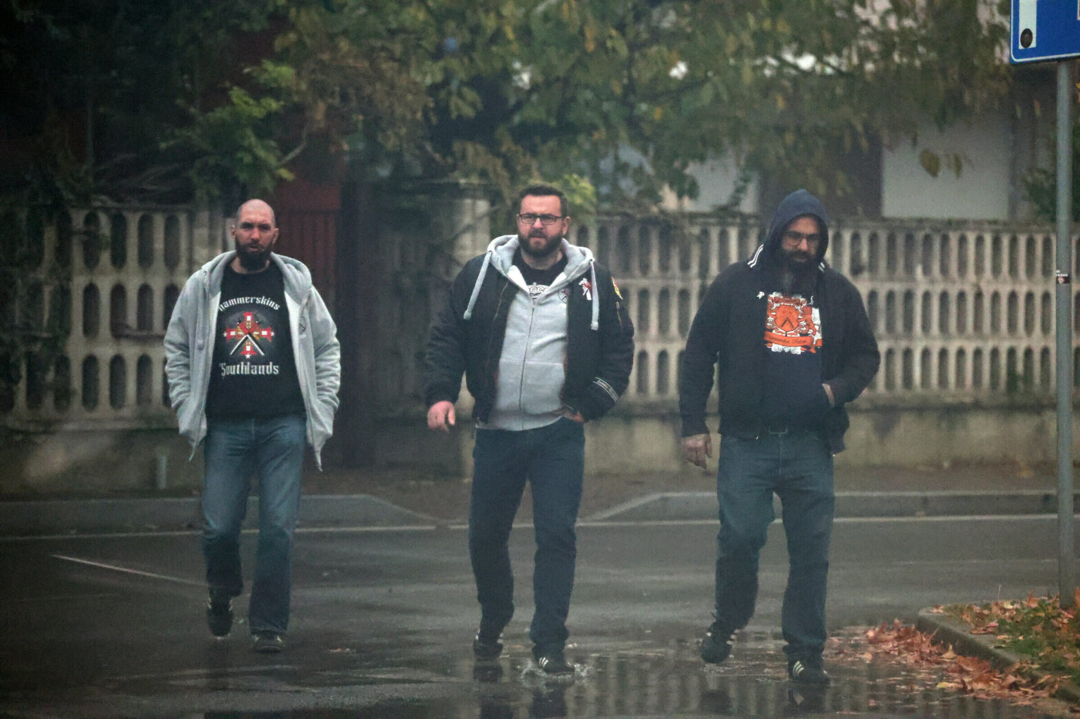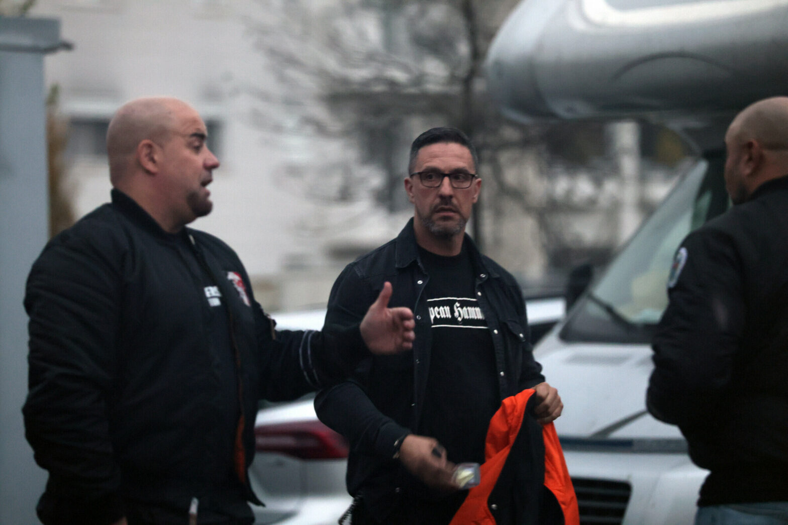 Die ungarischen Hammerskins Zoltan Papp (Vordergrund), Krisztian Szlavecz (links hinter Papp) und Imre Mészei (rechts von Papp) am Einlass des „Hammerfest“ 2025 in Italien – Bildrechte: Exif-Recherche