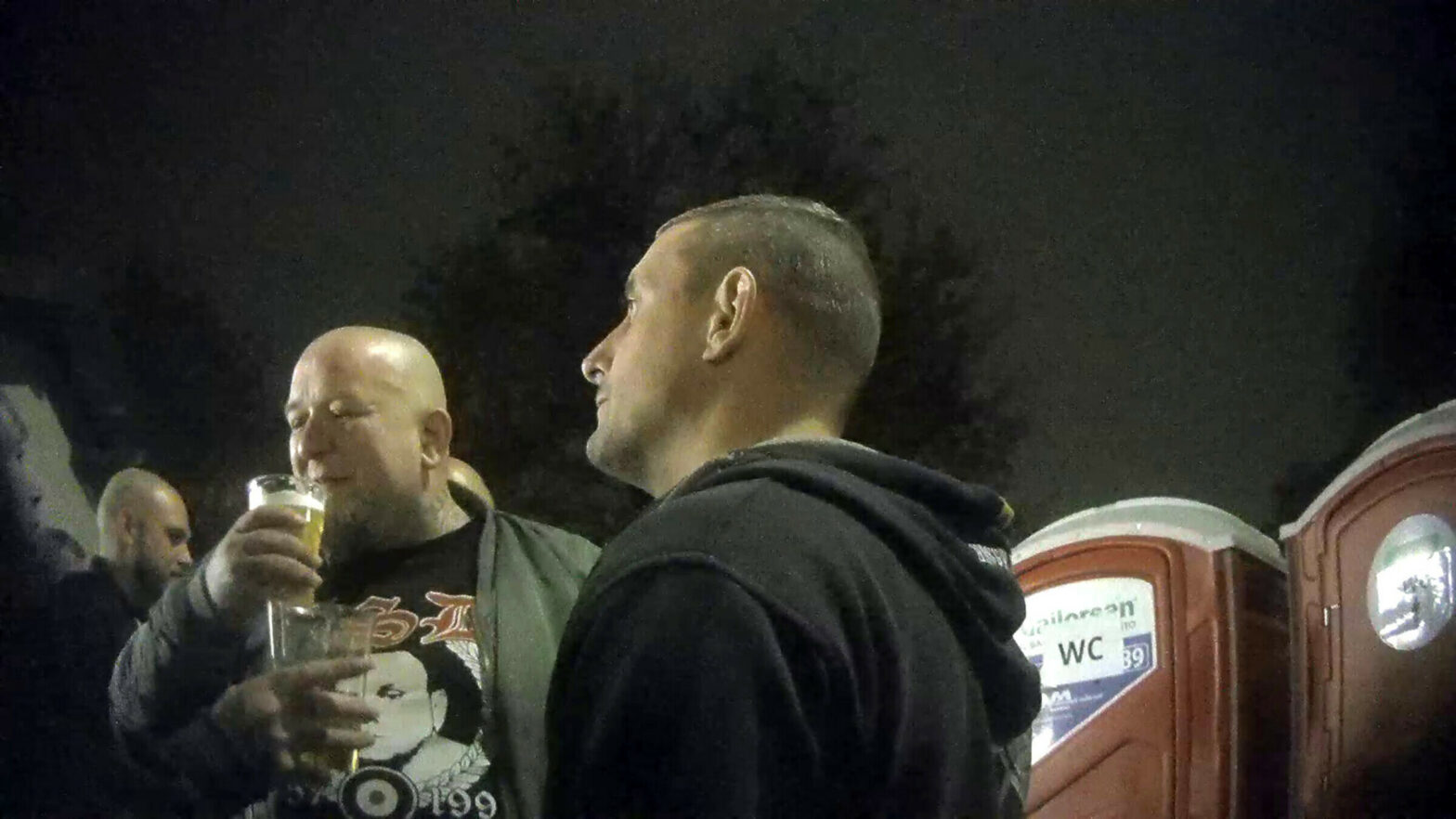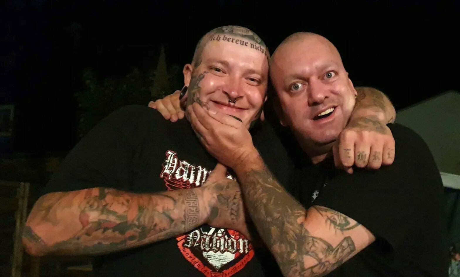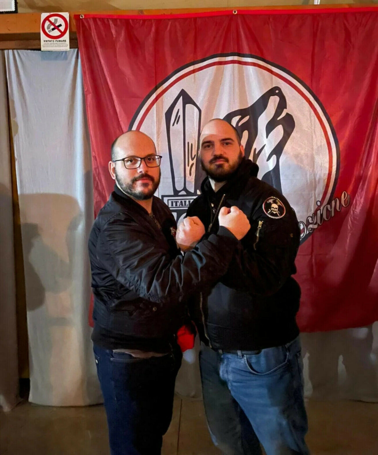 Der französische Hammerskin Gregoire Chappaz (rechts) auf dem „Hammerfest“ 2025 in Italien – Bildrechte: Exif-Recherche