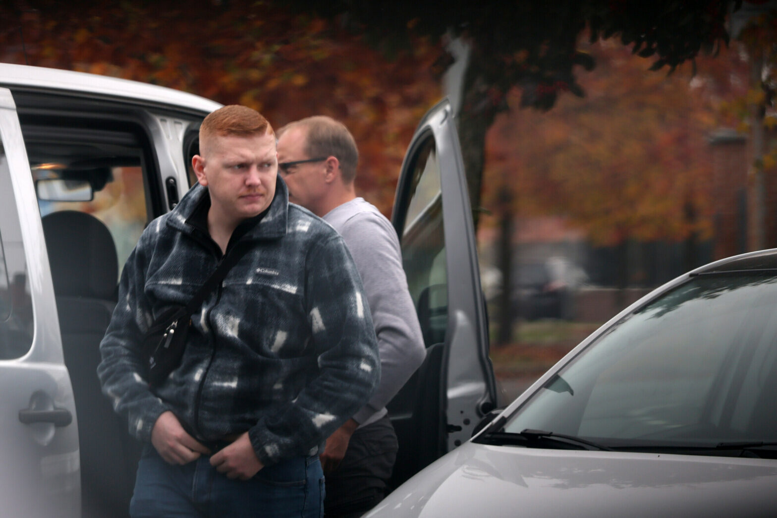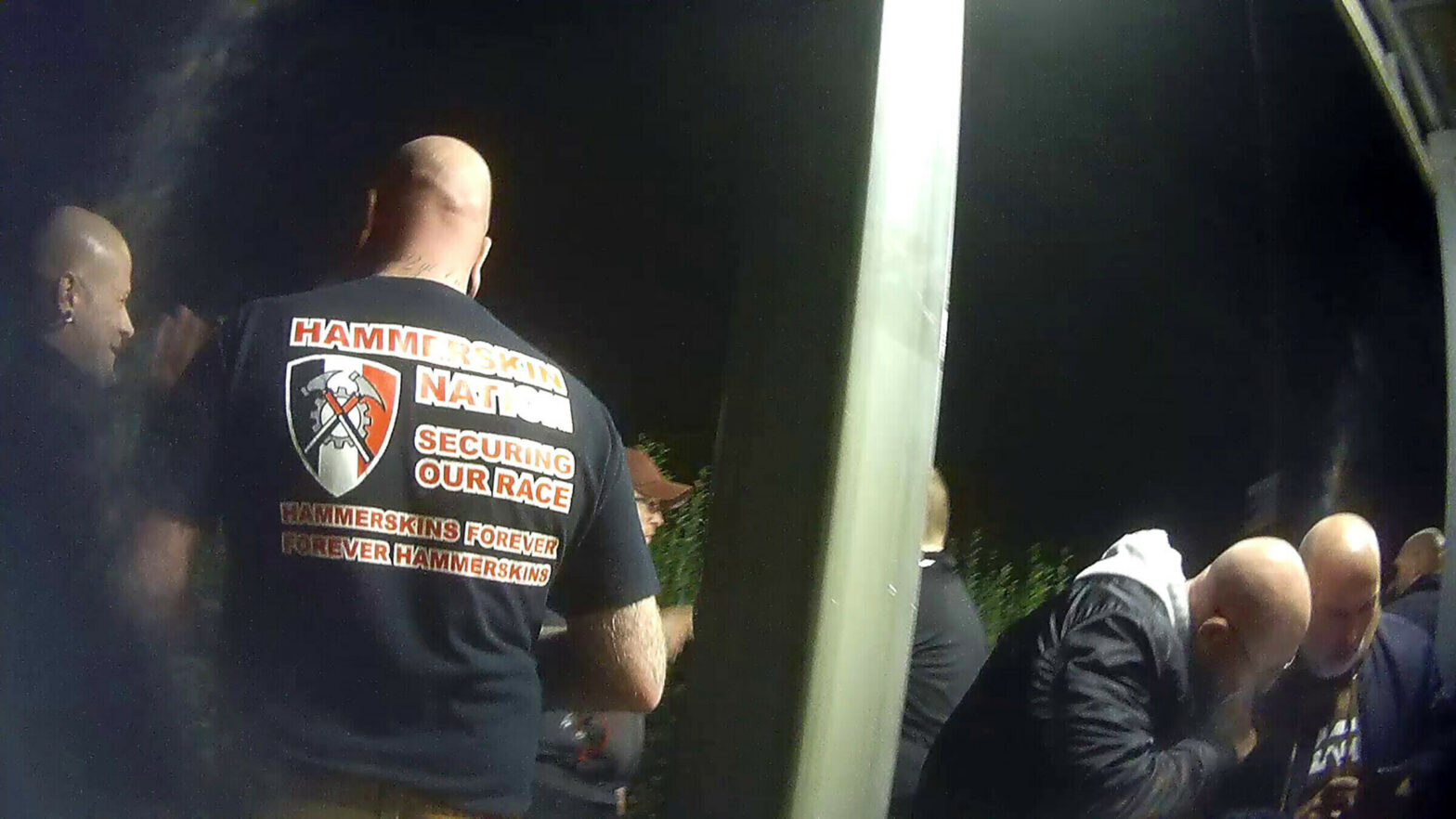 Rademacher und Sascha Kaminski. Mit einem Pullover bekleidet, auf dem der Schriftzug „Hammerskins“ und die gekreuzten Hämmer zu sehen w