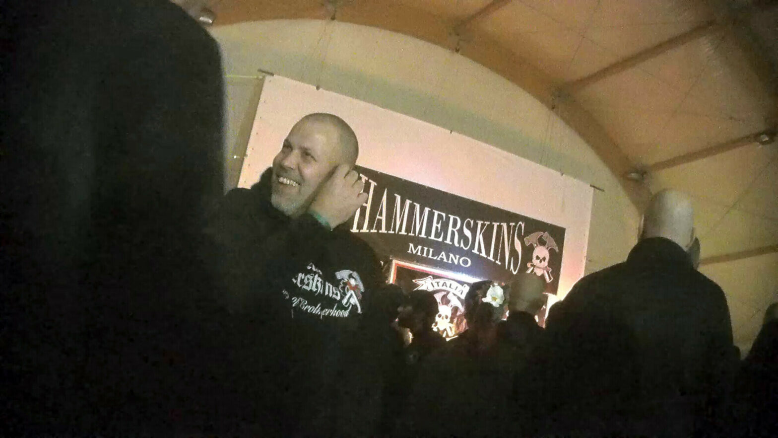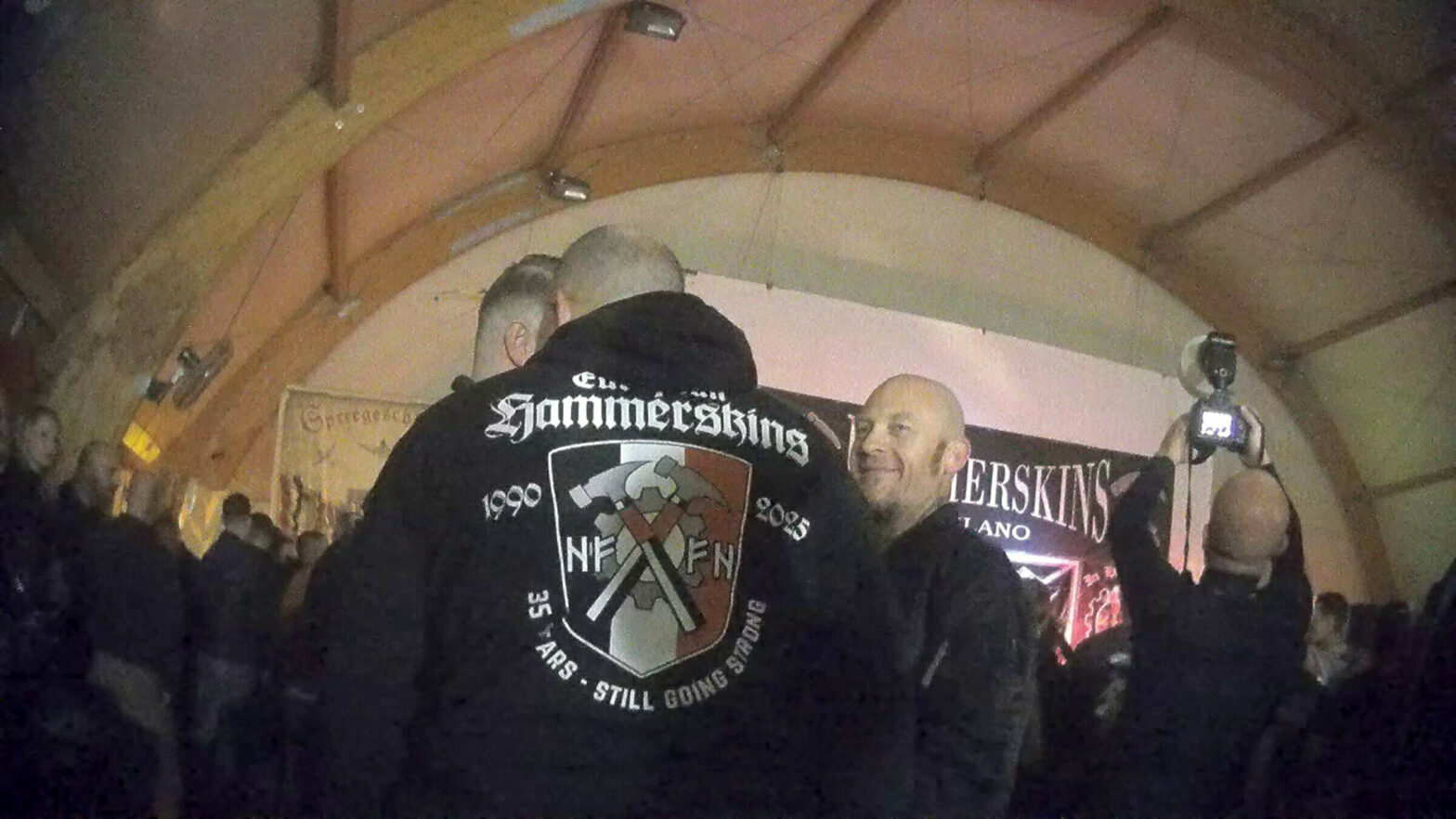 Es ist der 15. November 2025. Ein nasser und grauer Samstagabend in Lonate Pozzolo (Region Varese), nördlich der italienischen Metropole Mailand. Um die 500 Neonazis aus ganz Europa und darüber hinaus finden sich in einer Leichtbauhalle ein, um das 30-Jährige Bestehen der «Italia Hammerskins» zu feiern. „Hammerfest“ steht in großen Lettern auf den laminierten Getränkekarten und auf der Preistafel am Imbiss. Fotografieren ist strengstens untersagt. Im Publikum befinden sich etwa 150 Personen, die der «Hammerskin Nation», kurz HSN, angehören. Viele davon zeigen ihre Zugehörigkeit zur „Nation“ durch das Tragen einer uniform-artigen Bomberjacke mitsamt Patches (Aufnäher) ihres Chapters, den regionalen Ablegern der HSN. Die anwesenden deutschen Hammerskins verzichten an diesem Abend allerdings auf diese Uniform. Stattdessen funkelt hier und da ein kleiner Metall-Pin am Kragen der Jacke, der aus zwei gekreuzten Hämmern besteht, die mit einem Zahnrad hinterlegt sind. Wieder andere tragen „nur“ abnehmbare Patches oder Bekleidung, auf der der Schriftzug „Hammerskins“ oder die „Crossed Hammers“ zu sehen sind, dem Organisationszeichen der HSN.
