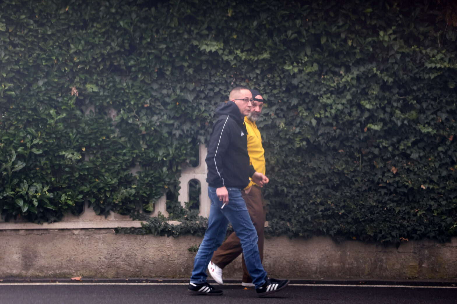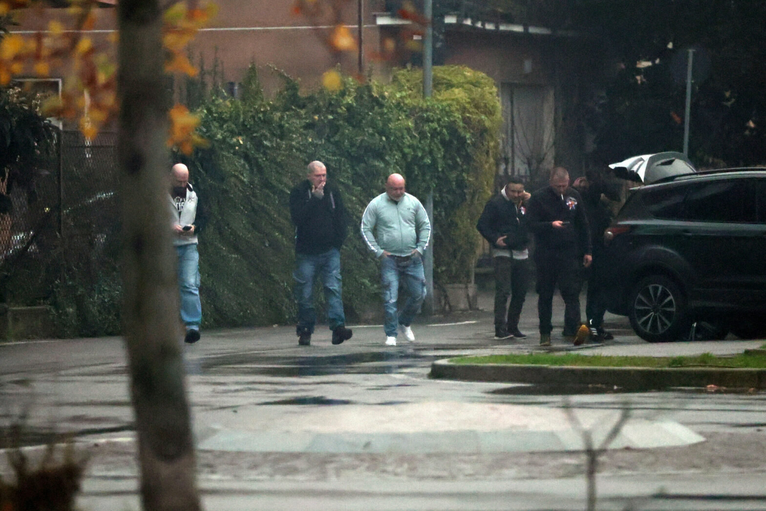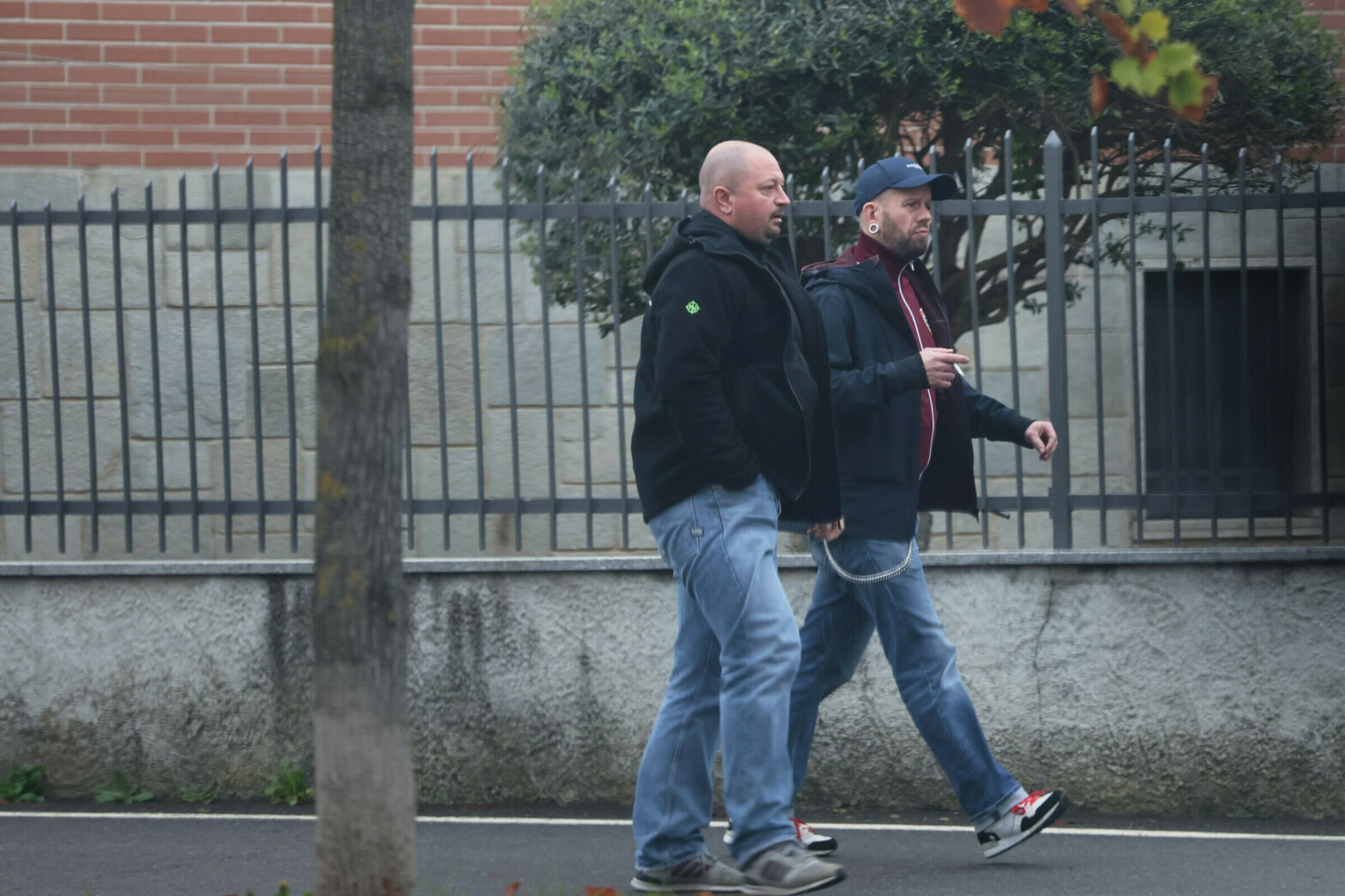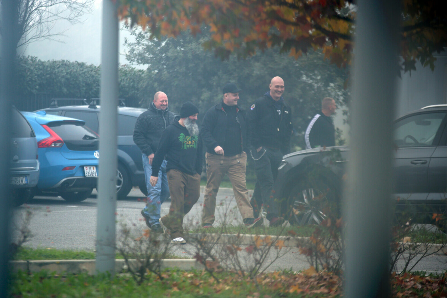 Die französischen Hammerskins David Strozza (1.v.l.) und Christophe Saccavini (2.v.l.), mit einem unbekannten Hammerskin vom Chapter «North France», sowie Yoan Voignier von der «Crew 38 North France», auf dem Weg zum EOM am Nachmittag des „Hammerfest“ 2025 in Italien – Bildrechte: Exif-Recherche