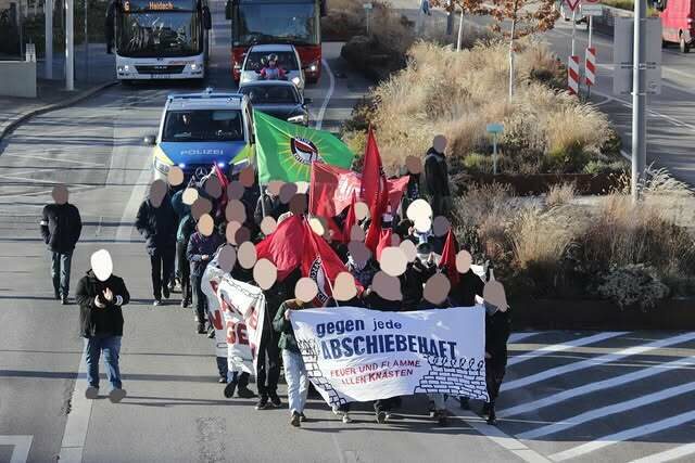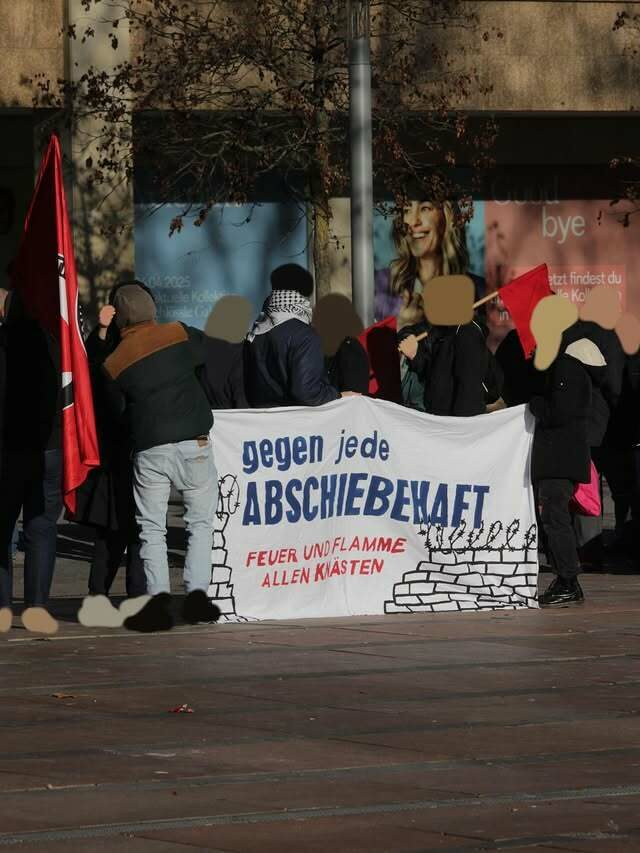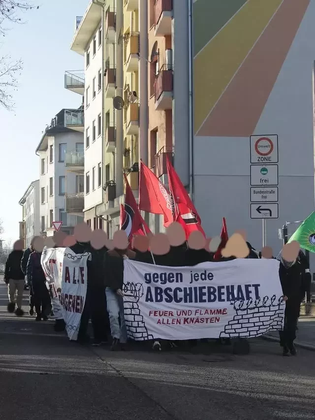 Neben der Demonstration in Karlruhe gab es in vielen Städten Grüße an linke Gefangene. Zum Beispiel an Leandra von den sog. Ulm5 in Memmingen. In Stuttgart gab es an der berüchtigten JVA in Stammheim bereits einige Tage vor Silvester eine spontane, unangemeldete Demonstration; den Bericht findet ihr hier. Am Nachmittag des 31.12.2025 zogen einige Genoss:innen u.a. vom OAT auch in Pforzheim ans dortige Abschiebegefängnis, um – auch mit Feuerwerk – die Gefangenen zu grüßen: