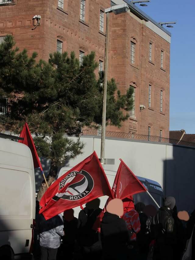 Nachdem die Demonstration direkt an der Rückseite der JVA, die dort sitzenden Gefangenen mit Pyrotechnik und Raketen gegrüßt hatte, und der Fassade punktuell ein neuer Anstrich verpasst wurde, versuchten die Bullen die weitere Demoroute zu blockieren. Nach kurzem Manöver auf welcher Seite sich für uns der beste Ausweg befinden könnte, lösten die Bullen die Versammlung vollständig und das führte dazu, dass diverse Kleingruppen selbstständig durch die Straßen ziehen konnten. Dies geschah unter stets anwachsender Polizeiverfolgung. Aber durch unsere Spontanität und die sichtlich mit der Situation überforderten Bullen war es für uns möglich eine Dynamik zu ergreifen und somit die die Einsatzkräfte zu zwingen sich spontan an die Gegebenheiten anpassen zu müssen.