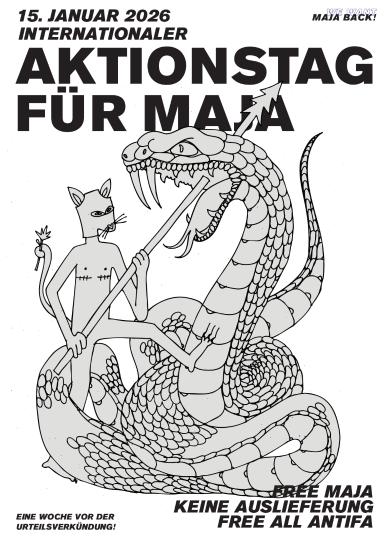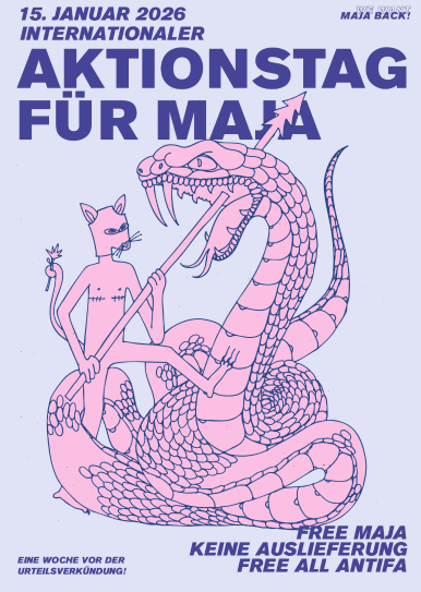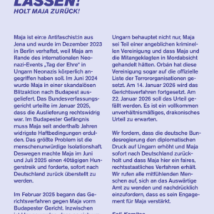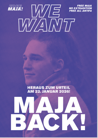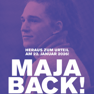 Deshalb: Nehmt an unserem Aktionstag für Majas sofortige Rückführung und die Freiheit aller angeklagten Antifaschist*innen teil. Lasst uns diese Forderung wieder in die Öffentlichkeit und auf die Straße tragen. Helft uns, den Druck auf die verantwortlichen Politiker*innen wieder aufzubauen, organisiert Proteste und zeigt den Angeklagten eure Solidarität. Wir werden nicht aufhören!