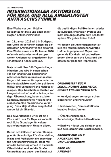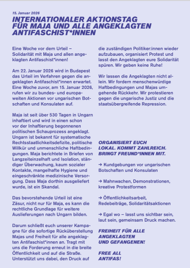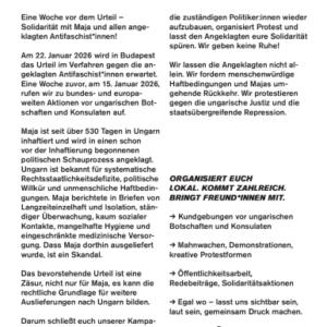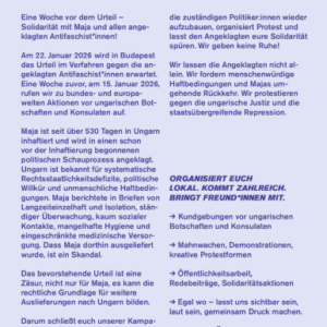 Am 22. Januar 2026 wird in Budapest das Urteil im Prozess gegen die angeklagten Antifaschist*innen erwartet. Eine Woche zuvor, am 15. Januar 2026, rufen wir zu bundesweiten und europaweiten Aktionen vor ungarischen Botschaften und Konsulaten auf.