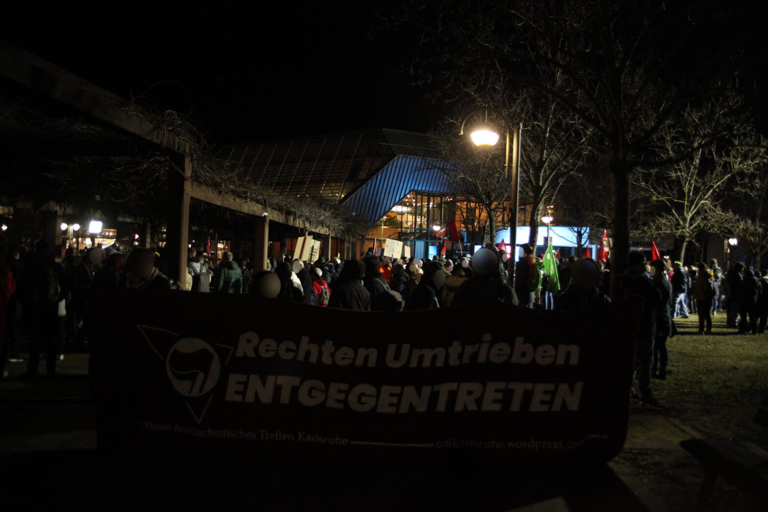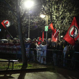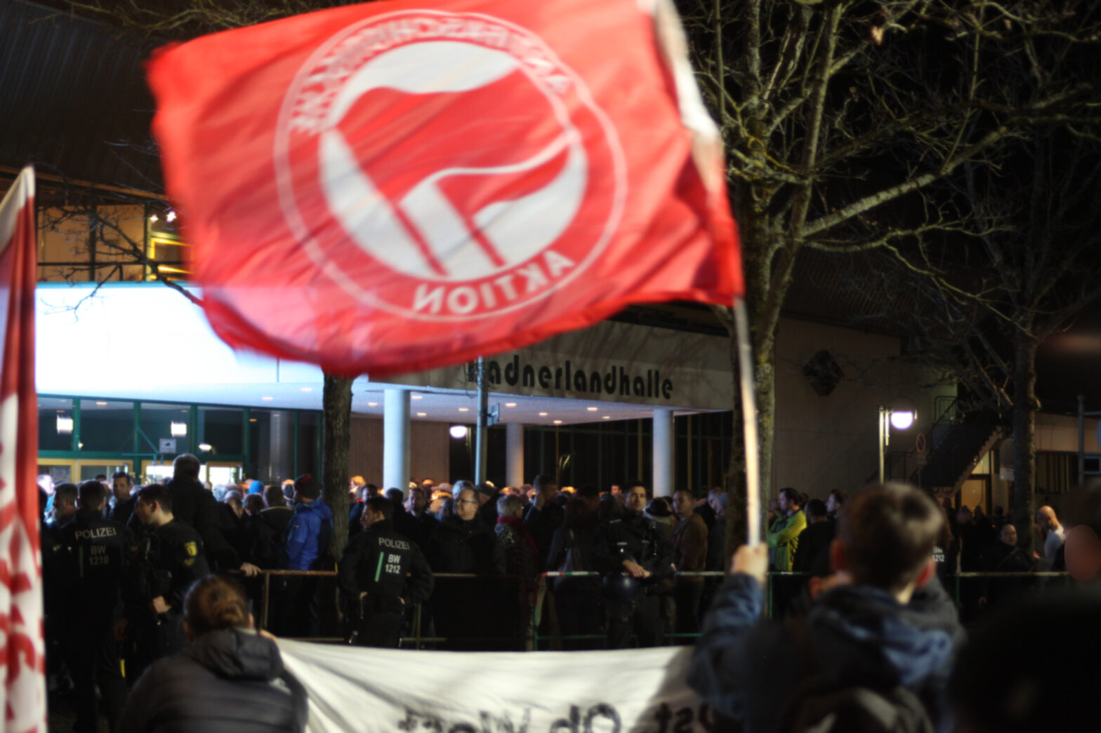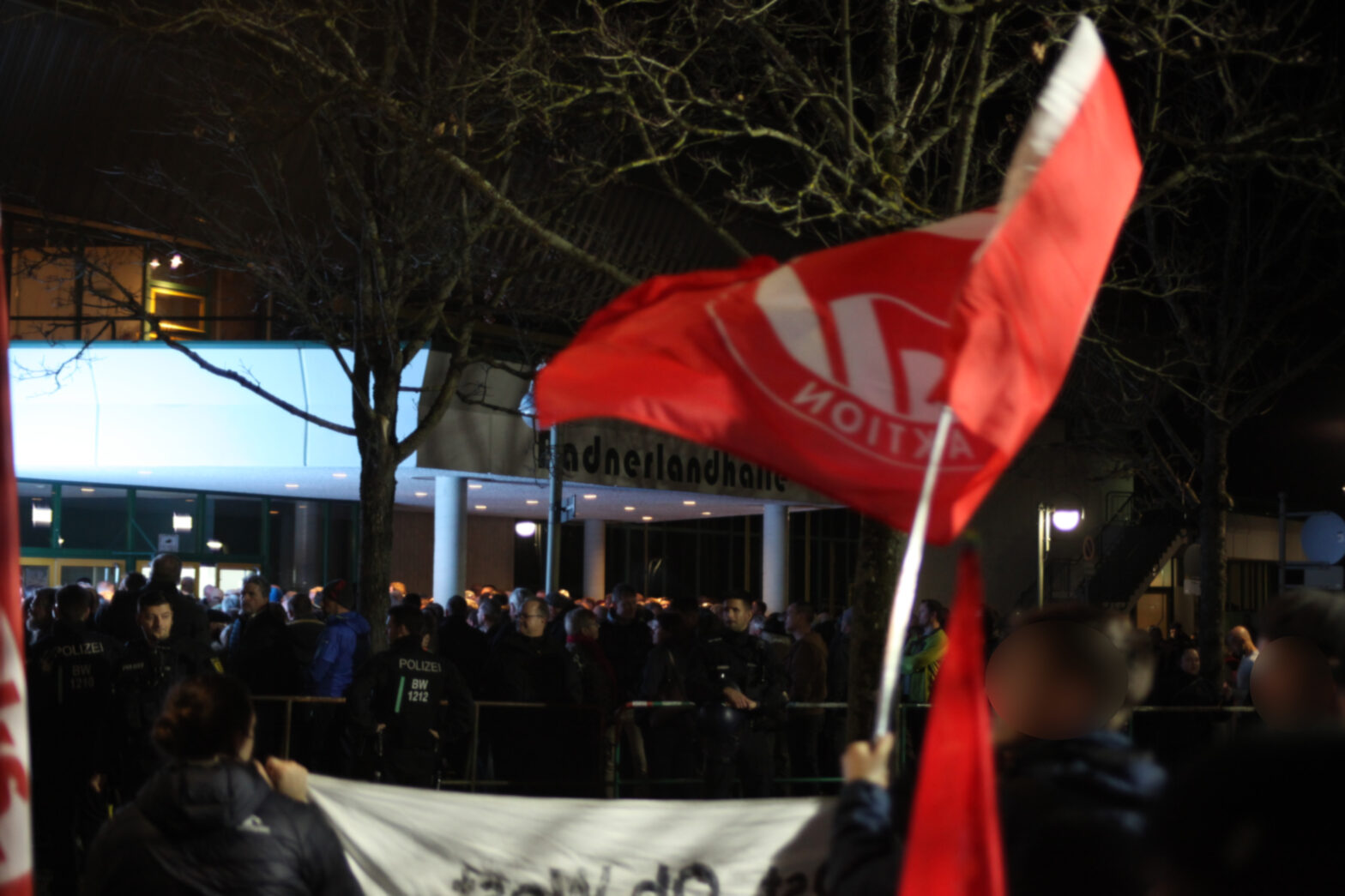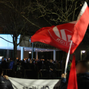 Nachdem wir schon am Morgen beim Warnstreik der Tarifbeschäftigten der Länder den Streik unterstützt haben und für den Protest gegen die AfD Veranstaltung mobilisiert hatten, kamen am Abend etwa 300 Menschen vor der Badnerlandhalle zusammen, um gegen das „große Gipfeltreffen“ der AfD zu demonstrieren. Die Hauptredner bei der AfD-Veranstaltung waren die beiden Ministerpräsidentskandidaten und Bundestasabgeordneten Frohnmaier und Siegmund.