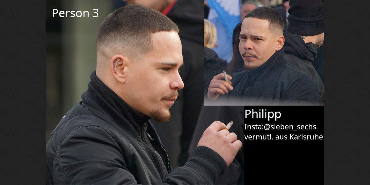 Person 3: Philip, auf Instagram @sieben_sechs, was vermutlich auf eine Postleitzahl schließen lässt (Großraum Karlsruhe). Gehörte zur C-60 Bruderschaft und war ebenfalls z.B. auf der CSD Gegenveranstaltung in Pforzheim im C-60 Shirt anwesend.