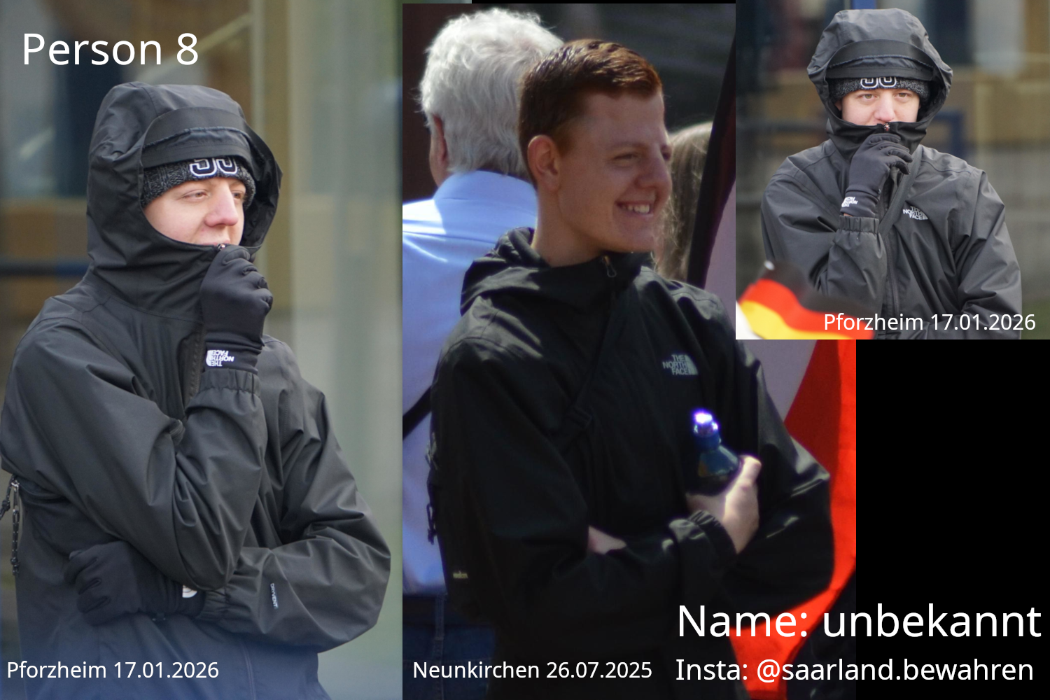 Person 8: Unbekannt, betreibt vermutlich den Instagram Account @saarland.bewahren und kommt dementsprechend wahrscheinlich aus dem Saarland. Bei der GfD Demonstration am 26.07.2025 in Neunkirchen (Saarland) sowie bei der CSD Gegenveranstaltung war er auch dabei. Connected mit Person 4 und 5.