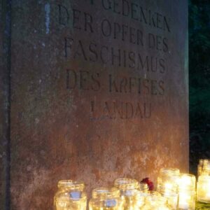 Zum Abschluss sangen wir gemeinsam „Die Moorsoldaten“ und erinnerten uns an den Schwur von Buchenwald. Denn all das, was wir als Antifaschist:innen immer wieder tun – Demonstrationen organisieren, Gedenkveranstaltungen gestalten, Vorträge halten, Bildungsangebote, streiten, diskutieren, aufklären und uns im Alltag einmischen –, entspringt letztlich der festen Überzeugung, dass der Faschismus in all seinen Erscheinungsformen überwunden werden muss. Jede einzelne dieser Tätigkeiten, ob sichtbar auf der Straße oder leise im Hintergrund, ob in Landau oder sonst wo, soll doch am Ende eines ermöglichen: eine Gesellschaft, in der solche Verbrechen nie wieder möglich sind.