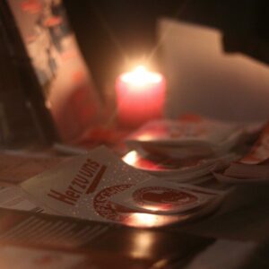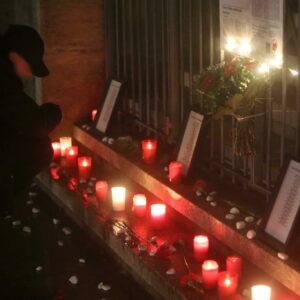 Zu Abschluss der Kundgebung haben wir an der Stiftskirche gemeinsam einen Gedenkort aufgebaut, bei dem die Namen der aus Tübingen deportierten und ermordeten Jüdinnen und Juden und einige Lebensgeschichten von Tübinger Jüdinnen und Juden gezeigt werden. Dazu wurden Blumen und Grabkerzen abgelegt. Im Anschluss wurden, nach jüdischer Tradition, Steine als Gedenken an die Ermordeten abgelegt.