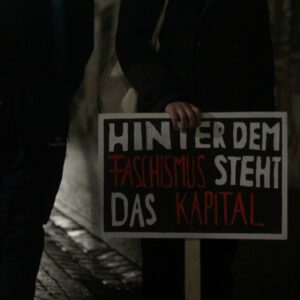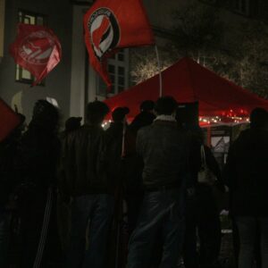 Das Gedenken begannen wir mit einer Rede, in der wir beschrieben, wie der Antisemitismus ein „zentrales ideologische(s) Fundamente war, um die Herrschaft der Kapitalisten zu sichern“ und wie die Nazis Jüdinnen und Juden verantwortlich für die schweren Krise des Kapitalismus machten, während es stattdessen „die räuberischsten und reaktionärsten Teile des deutschen Finanzkapitals (waren) die eine großes Interesse an der Machtergreifung der Nazis hatten“.