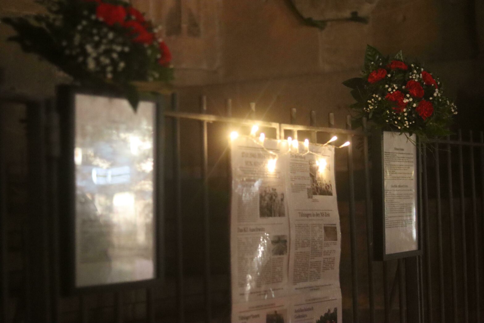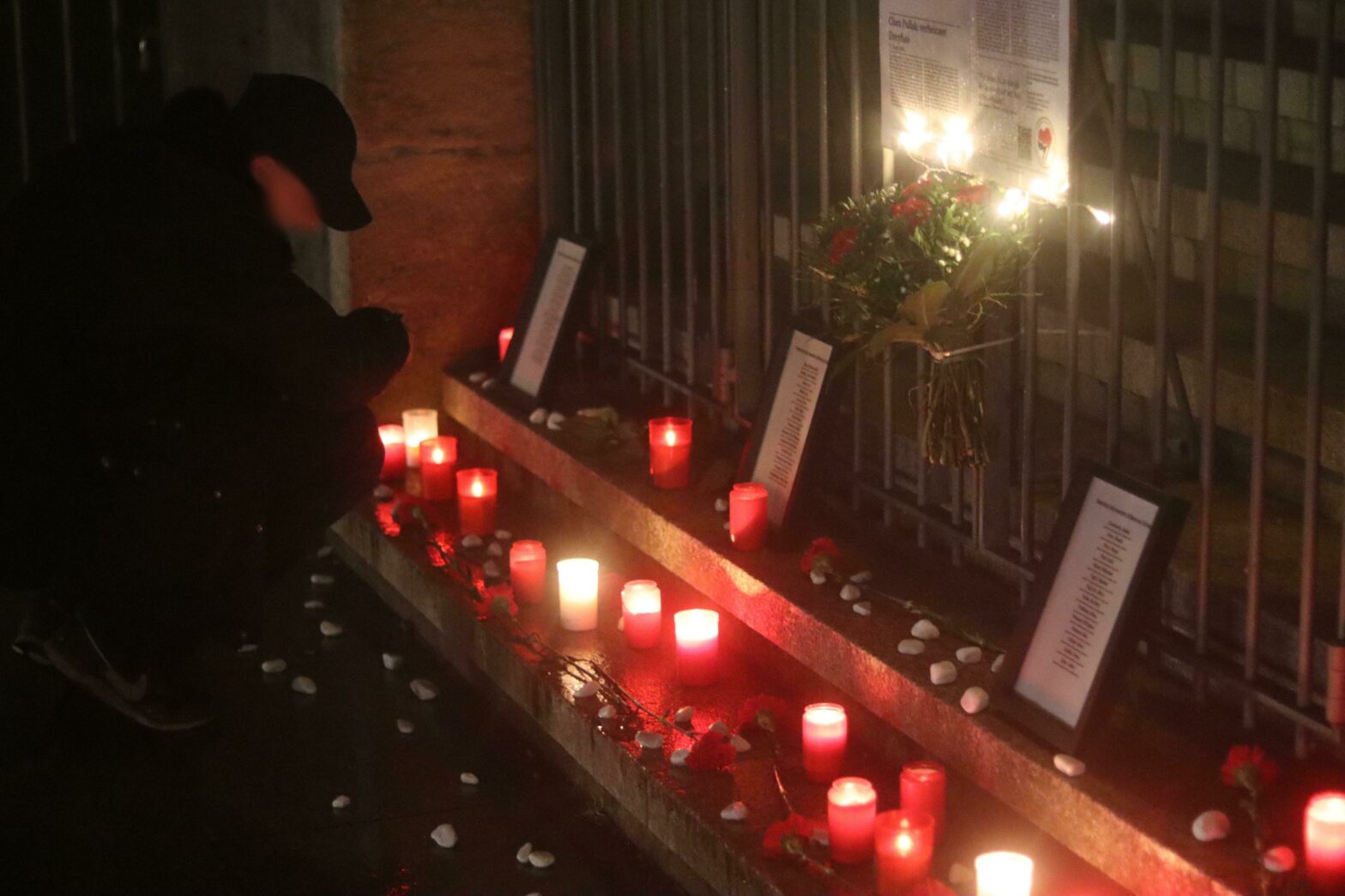 Zu Abschluss der Kundgebung haben wir an der Stiftskirche gemeinsam einen Gedenkort aufgebaut, bei dem die Namen der aus Tübingen deportierten und ermordeten Jüdinnen und Juden und einige Lebensgeschichten von Tübinger Jüdinnen und Juden gezeigt werden. Dazu wurden Blumen und Grabkerzen abgelegt. Im Anschluss wurden, nach jüdischer Tradition, Steine als Gedenken an die Ermordeten abgelegt.