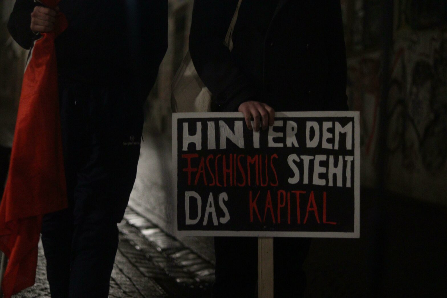 Das Gedenken begannen wir mit einer Rede, in der wir beschrieben, wie der Antisemitismus ein „zentrales ideologische(s) Fundamente war, um die Herrschaft der Kapitalisten zu sichern“ und wie die Nazis Jüdinnen und Juden verantwortlich für die schweren Krise des Kapitalismus machten, während es stattdessen „die räuberischsten und reaktionärsten Teile des deutschen Finanzkapitals (waren) die eine großes Interesse an der Machtergreifung der Nazis hatten“.