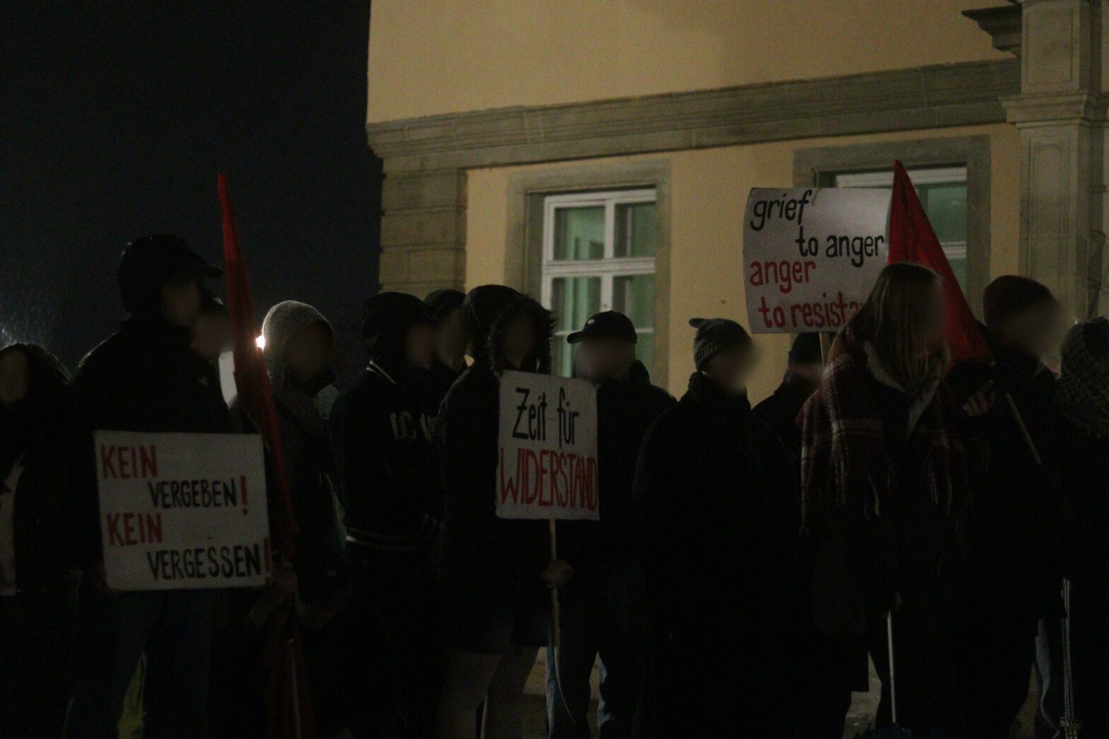 Danach wurde auf den aktuellen Antisemitismus in der neuen Rechten eingegangen. Dieser zeige sich in einem Strategiewechsel der Rechten. „Anstatt zu leugnen, relativieren sie (…) Täter werden zu Opfern gemacht, Verantwortung wird verwischt. So werden der Holocaust und die Verbrechen verharmlost“. Zum Ende der Rede wurde die Notwendigkeit des antifaschistischen Kampfes betont und wie wichtig es ist, das Leben und die Geschichten der der im Holocaust Ermordeten niemals zu vergessen.