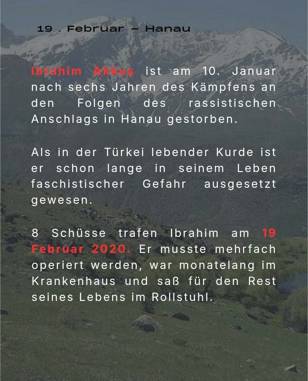 Als in der Türkei lebender Kurde hatte er schon lange vor dem 19. Februar 2020 rechten Terror erlebt. Sein Bruder wurde nach einem abgelehnten Asylantrag 1980 in der Türkei von Faschisten ermordet. „Ich bin in meinem Leben nur dem Schmerz begegnet“, sagte Ibrahim mal in einem Interview. Zwei Brüder. Zwei Morde.