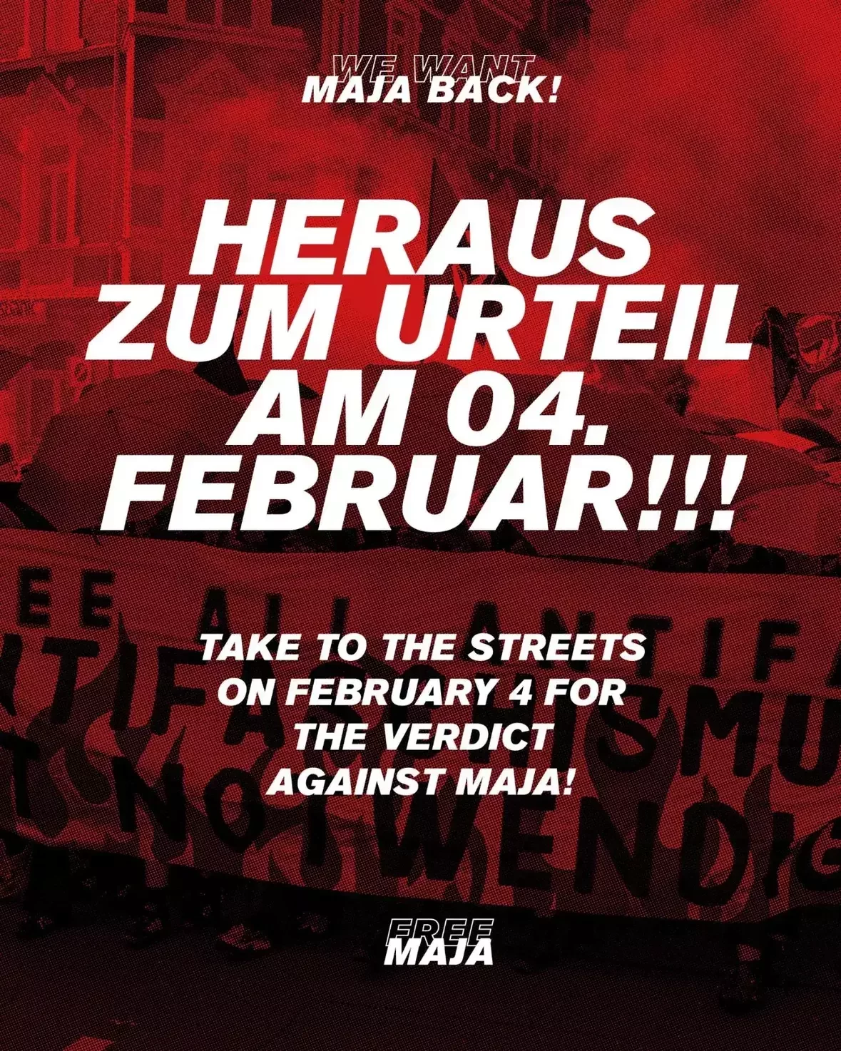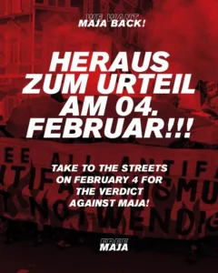 Außerdem wird in Kürze das Urteil für Maja, Gabri und Anna am 4. Februar 2026 in Budapest gesprochen. Maja ist nun seit mehr als 2 Jahren in Isolationshaft, davon mehr als 1,5 Jahre unter menschenunwürdigen Bedingungen in Budapest. Jetzt drohen Maja bis zu 24 Jahre Haft in Ungarn.