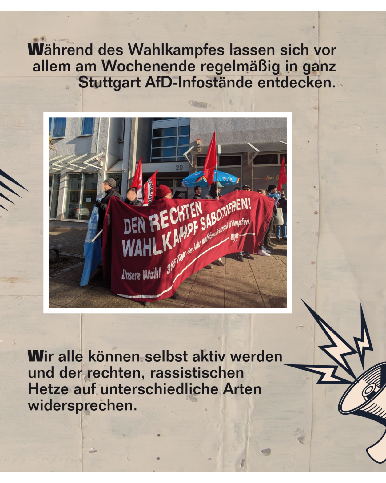 Aktiv werdenAllen anderen wollen wir, verstärkt in Zeiten des Wahlkampfs, sagen: Werdet überall aktiv gegen Rechts.Stellt euch im Alltag gegen die Normalisierung der AfD, lasst rechte Hetze nicht unwidersprochen, rechte Propaganda nicht stehen oder hängen. Beteiligt euch an Protesten und Aktionen – zum Beispiel am 24.02. – und bringt eure Leute am besten direkt mit. Organisiert euch direkt antifaschistisch oder unterstützt den Kampf gegen Rechts. Dieser fängt bei jeder Person einzeln an, kann aber nur gemeinsam zum Erfolg führen.
