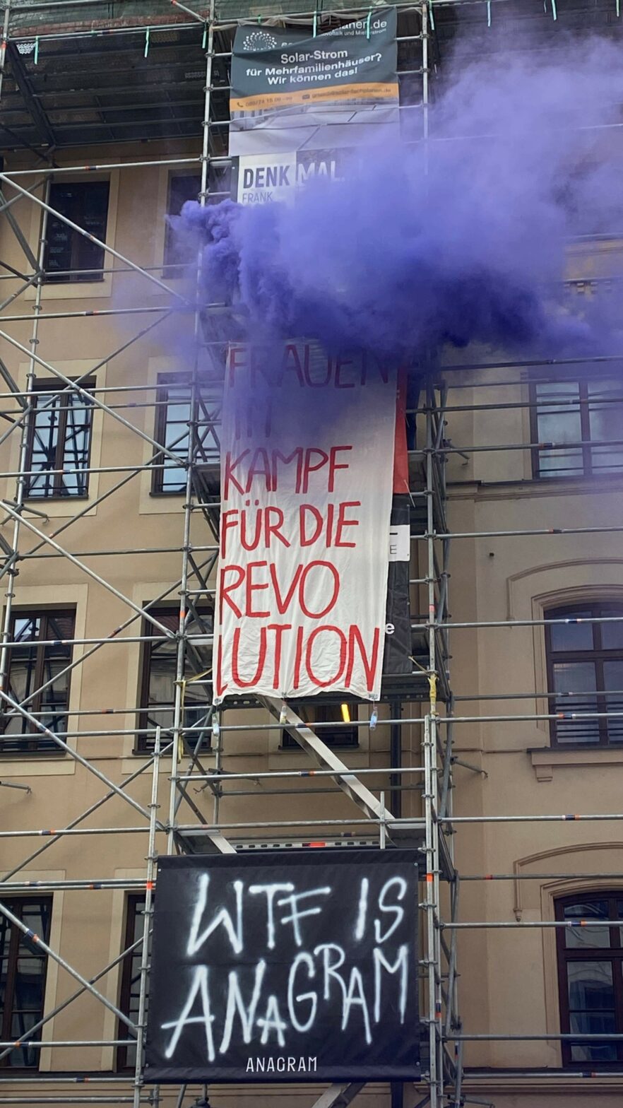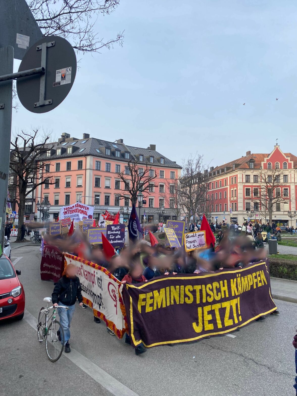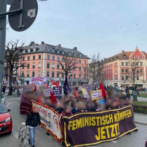 Gerade für uns – als Antifaschistinnen – ist der 8. März ein besonders wichtiges Datum im Jahr. Denn uns ist klar: Ohne den Sturz des Patriarchats und des Kapitalismus ist eine tatsächliche Befreiung nicht möglich und die Gefahr des Faschismus weiterhin präsent. Gerade jetzt, wo der Rechtsruck wieder an Wind aufnimmt, macht sich das besonders bemerkbar. So trauten sich heute neben Zionisten auch Faschisten der „Identitären Bewegung“, während des feministischen Aktionstags auf den Marienplatz, wurden aber kurzerhand bestimmt weggeschickt.
