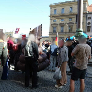 Schon von Beginn an hatten es die AfDler:innen schwer, in ihre Gitter zu kommen, und waren durchgehend von außen weder hör- noch sichtbar. Auch die Versuche der Bullen, den Protest an seinem Agieren zu hindern, taten ihm keinen Abbruch, und die AfDler:innen konnten nur unter hohem Geleitschutz ihre Kundgebungsfläche verlassen. Während des Protestes wurden Faschos, die nicht innerhalb des Gitters waren, verdrängt und lautstark Parolen gerufen. Auch unsere Flyer kamen in der Innenstadt gut an.