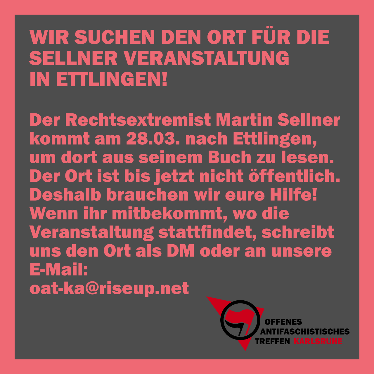 Wir fordern alle, die einen Tipp zum Veranstaltungsort haben, auf sich zu melden und damit den Rechten keinen Raum in Ettlingen zu geben.