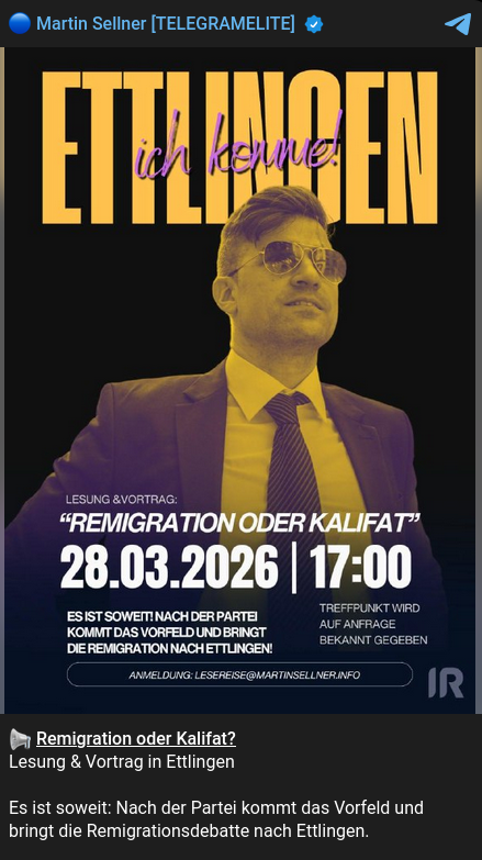Am 28.03.26 lädt Martin Sellner zu einer Lesung im Raum Ettlingen ein unter dem Titel „Remigration oder Kalifat“. Der Ort der Veranstaltung ist nicht öffentlich bekannt deshalb suchen wir mit diesem Aufruf den Ort an dem die Veranstaltung stattfinden soll.