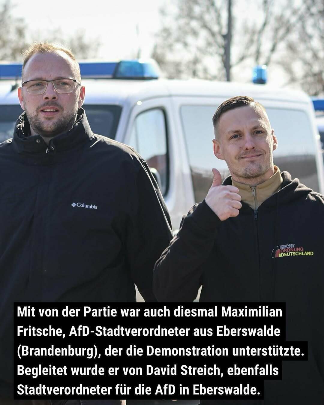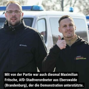 Mit von der Partie war auch diesmal Maximilian Fritsche, AfD-Stadtverordneter aus Eberswalde (Brandenburg), der die Demonstration unterstützte. Begleitet wurde er von David Streich, ebenfalls Stadtverordneter für die AfD in Eberswalde.