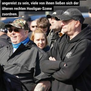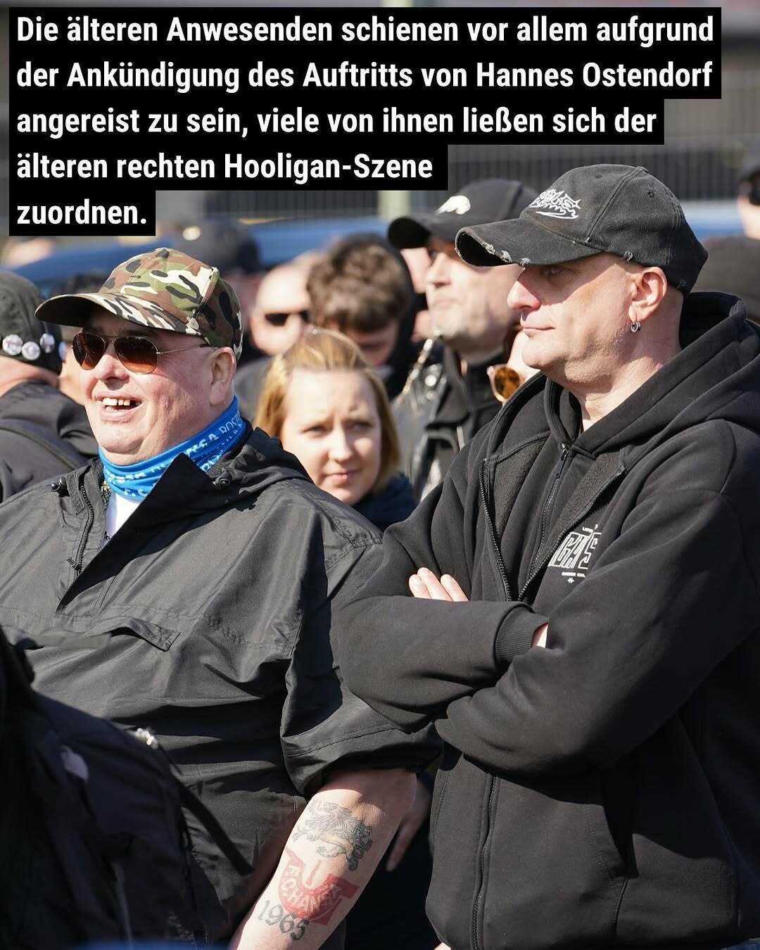 Die älteren Anwesenden schienen vor allem aufgrund der Ankündigung des Auftritts von Hannes Ostendorf angereist zu sein, viele von ihnen ließen sich der älteren rechten Hooligan-Szene zuordnen.