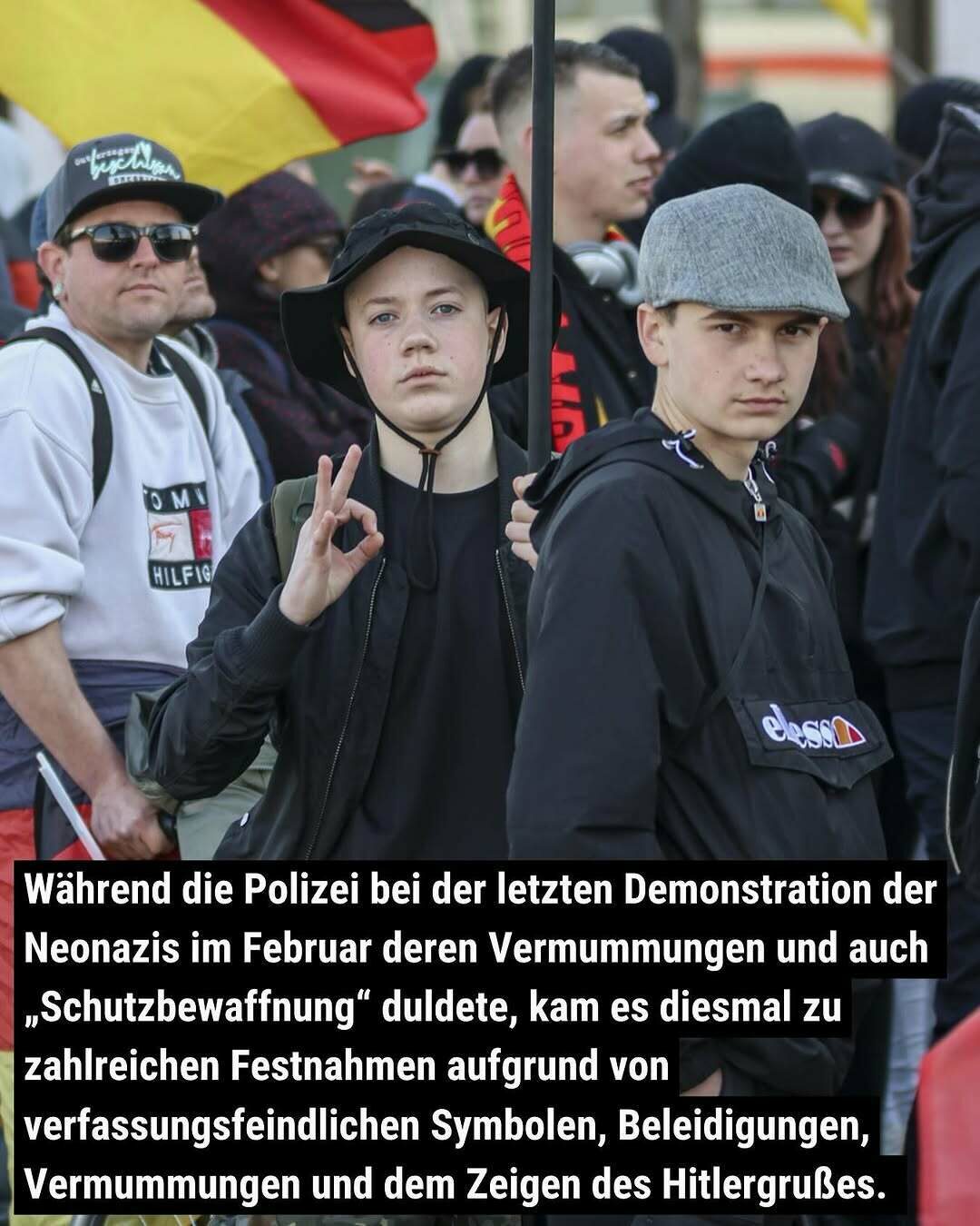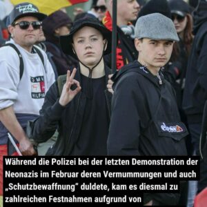Während die Polizei bei der letzten Demonstration der Neonazis im Februar deren Vermummungen und auch „Schutzbewaffnung“ duldete, kam es diesmal zu zahlreichen Festnahmen aufgrund von verfassungsfeindlichen Symbolen, Beleidigungen, Vermummungen und dem Zeigen des Hitlergrußes.