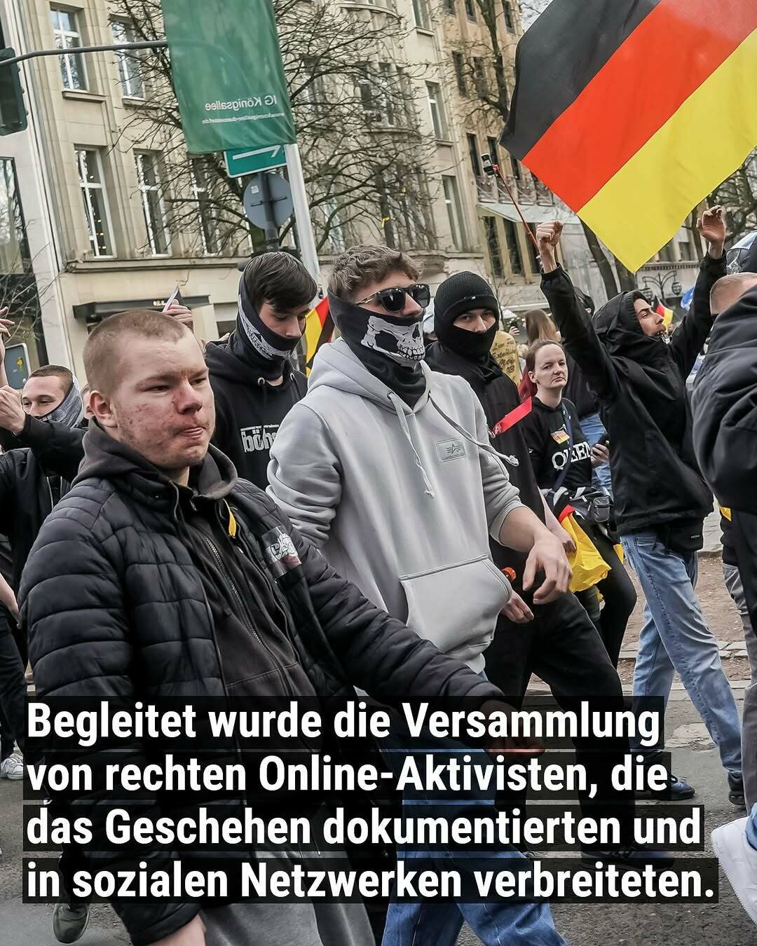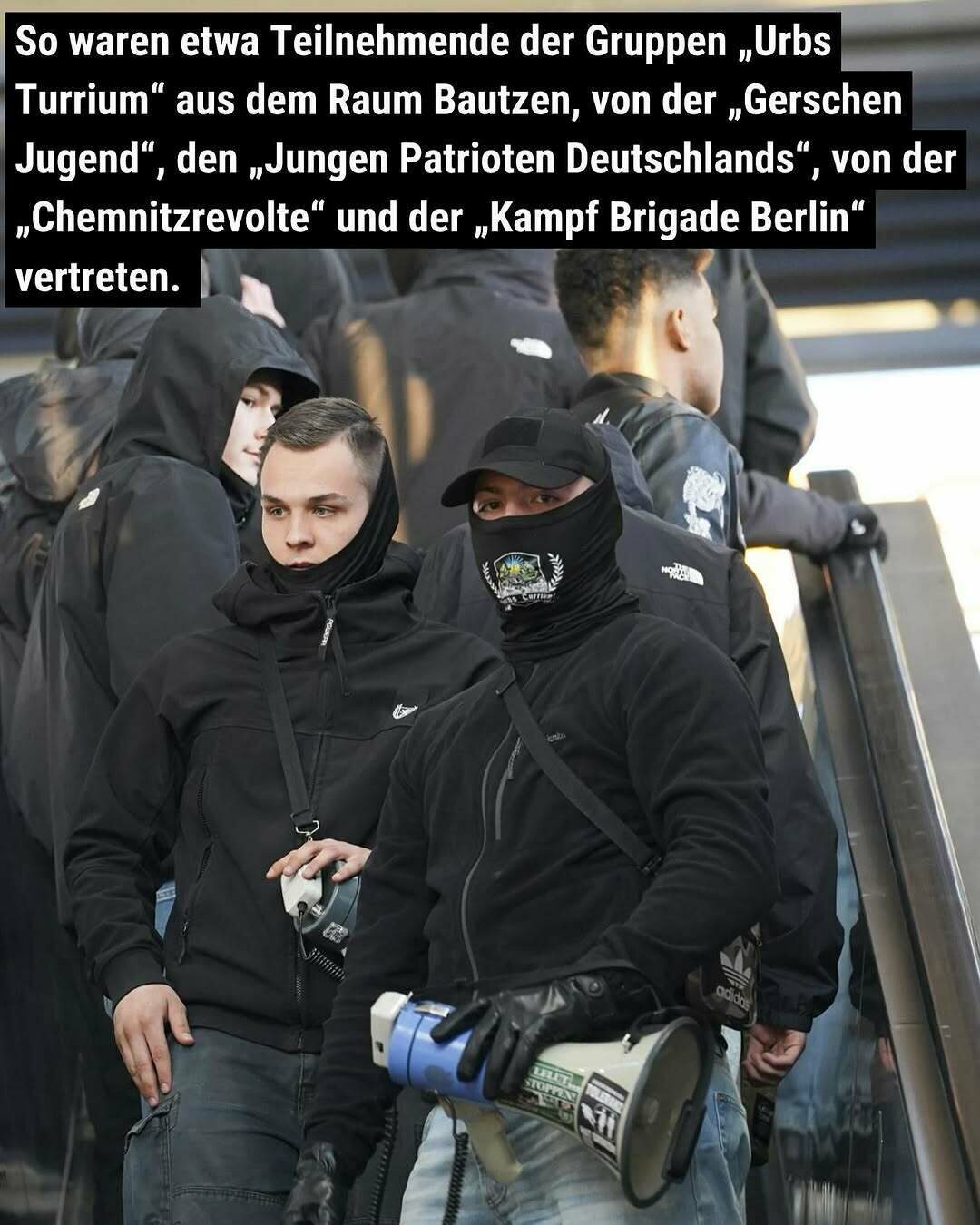 Aufgrund ihres Auftretens mit einheitlich schwarzer Kleidung, schwarz-rot-goldenen Sturmhauben, Symbolik der sogenannten „Altrechten“ wie Frakturschrift-T-Shirts oder schwarzen Sonnen ist davon auszugehen, dass sie dem Spektrum um NPD/JN zuzuordnen sind.