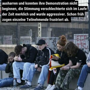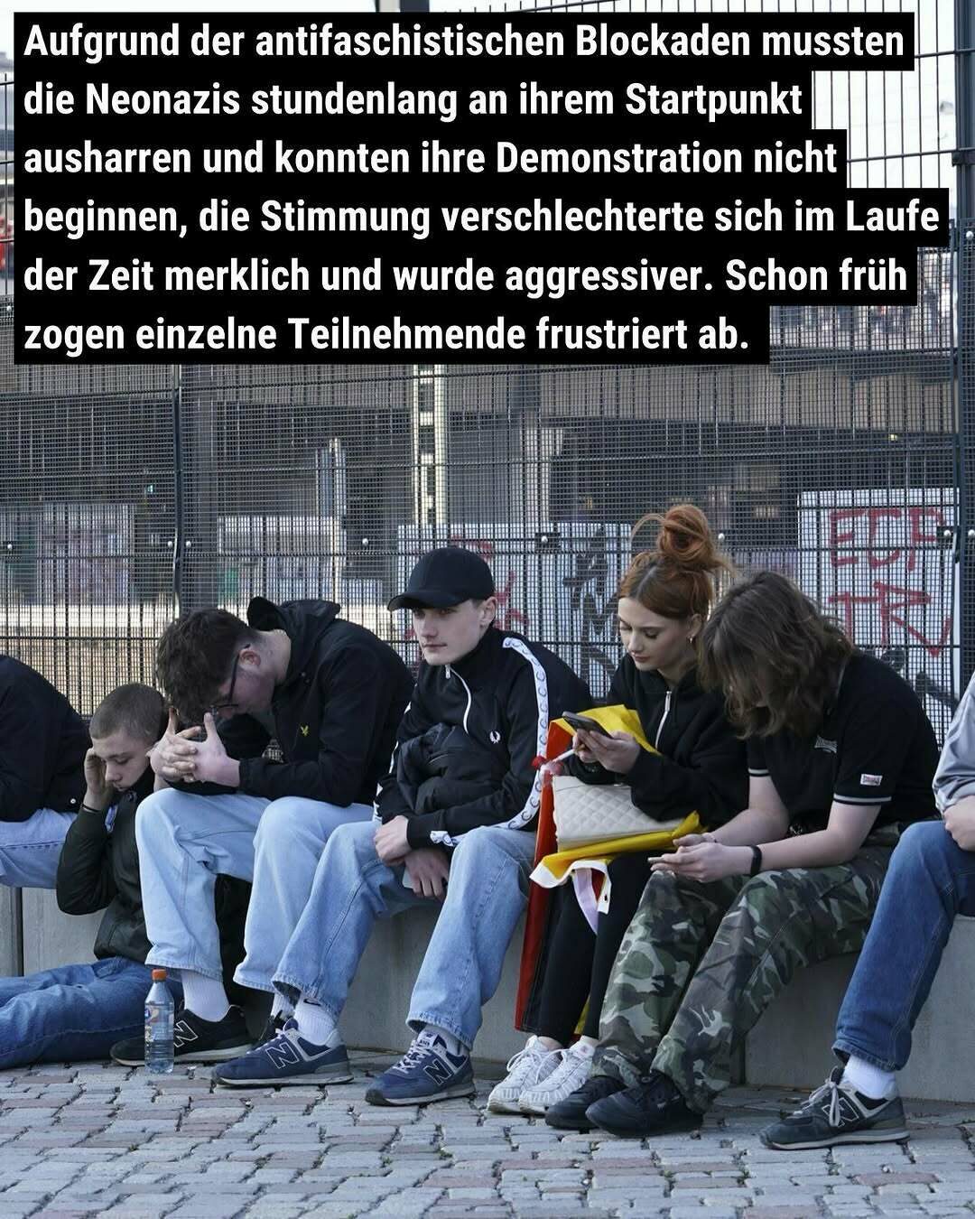Aufgrund der antifaschistischen Blockaden mussten die Neonazis stundenlang an ihrem Startpunkt ausharren und konnten ihre Demonstration nicht beginnen, die Stimmung verschlechterte sich im Laufe der Zeit merklich und wurde aggressiver. Schon früh zogen einzelne Teilnehmende frustriert ab.