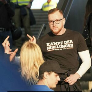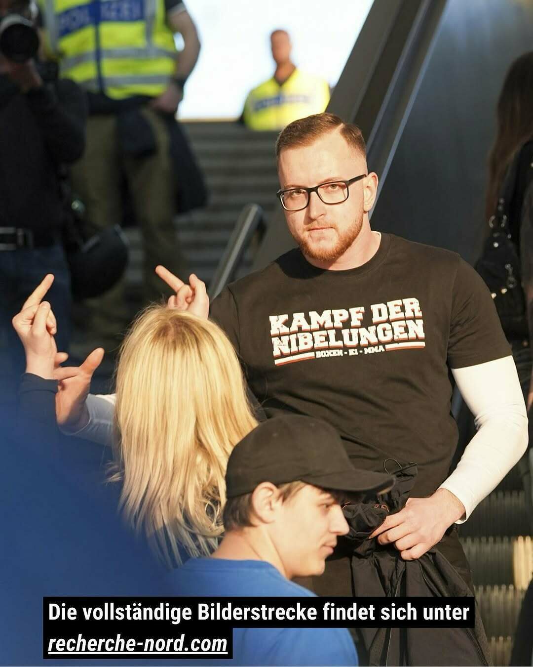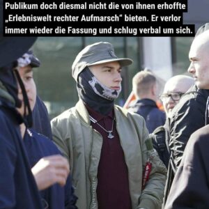Er interagierte auch mit einer Gruppe (Nr. 27-29), die am Rande der Demonstration standen und sich alles ansahen. Sie schienen sich zu kennen. Nr. 18 war Ordnerin der Demonstration und lief zweimal mit dem Gruppe mit. Es war nicht erkennbar, ob sie eine Person aus der Gruppe war, die Ordneraufgaben übernahm oder ob sie abgestellt war, die Gruppe zu betreuen. Sie blieb allerdings auch nach dem Demonstrationsgeschehen in der Nähe der Gruppe. Ansonsten befanden sich auch einzelne als Neonazis erkennbare Menschen unter den Demonstrierenden. So z. B. die Nr. 25 und Nr. 26, Träger einer Mütze mit einem Logo des neonazistischen Kampfsportevents “Kampf der Nibelungen (KDN)”.