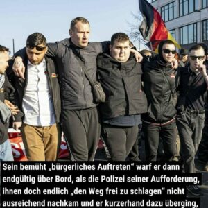 Zu einer Nur-Neonazi-Demonstration hat es in Baden-Württemberg ganz offensichtlich nicht gereicht. Den Anteil von gewaltbereiten Neonazis bzw. Jungfaschos schätzen wir auf mehr als 200 Personen, also etwa 1/7 aller Teilnehmenden. Damit war diese Demonstration zwar die größte Neonazi-Veranstaltung der letzten Jahre, war insgesamt aber eine Misch-Veranstaltung und erreichte noch nicht das Potenzial klassischer Neonazi-Demonstrationen wie in den 1990er, 2000er und 2010er Jahren im Südwesten. Beispielsweise fand am 1. Mai 2011 eine große Neonazi-Demonstration in Heilbronn mit fast 830 Beteiligten statt, die durchgängig dem Spektrum der parteigebundenen und parteifreien Neonazis entstammte.