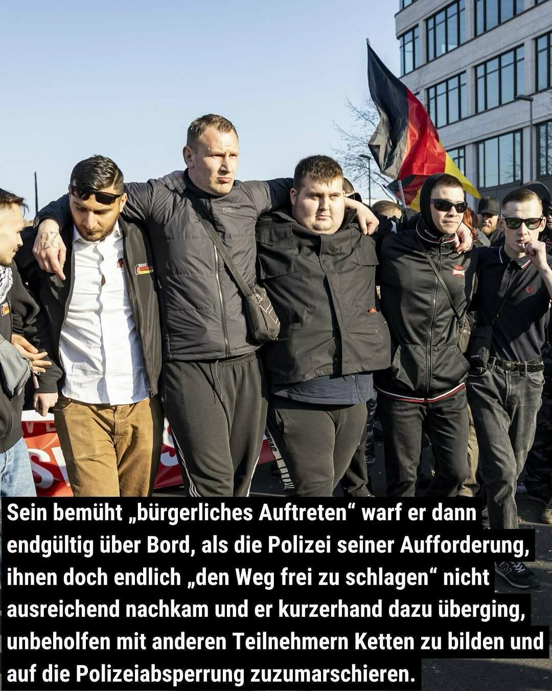 Sein bemüht „bürgerliches Auftreten“ warf er dann endgültig über Bord, als die Polizei seiner Aufforderung, ihnen doch endlich „den Weg frei zu schlagen“ nicht ausreichend nachkam und er kurzerhand dazu überging, unbeholfen mit anderen Teilnehmern Ketten zu bilden und auf die Polizeiabsperrung zuzumarschieren.