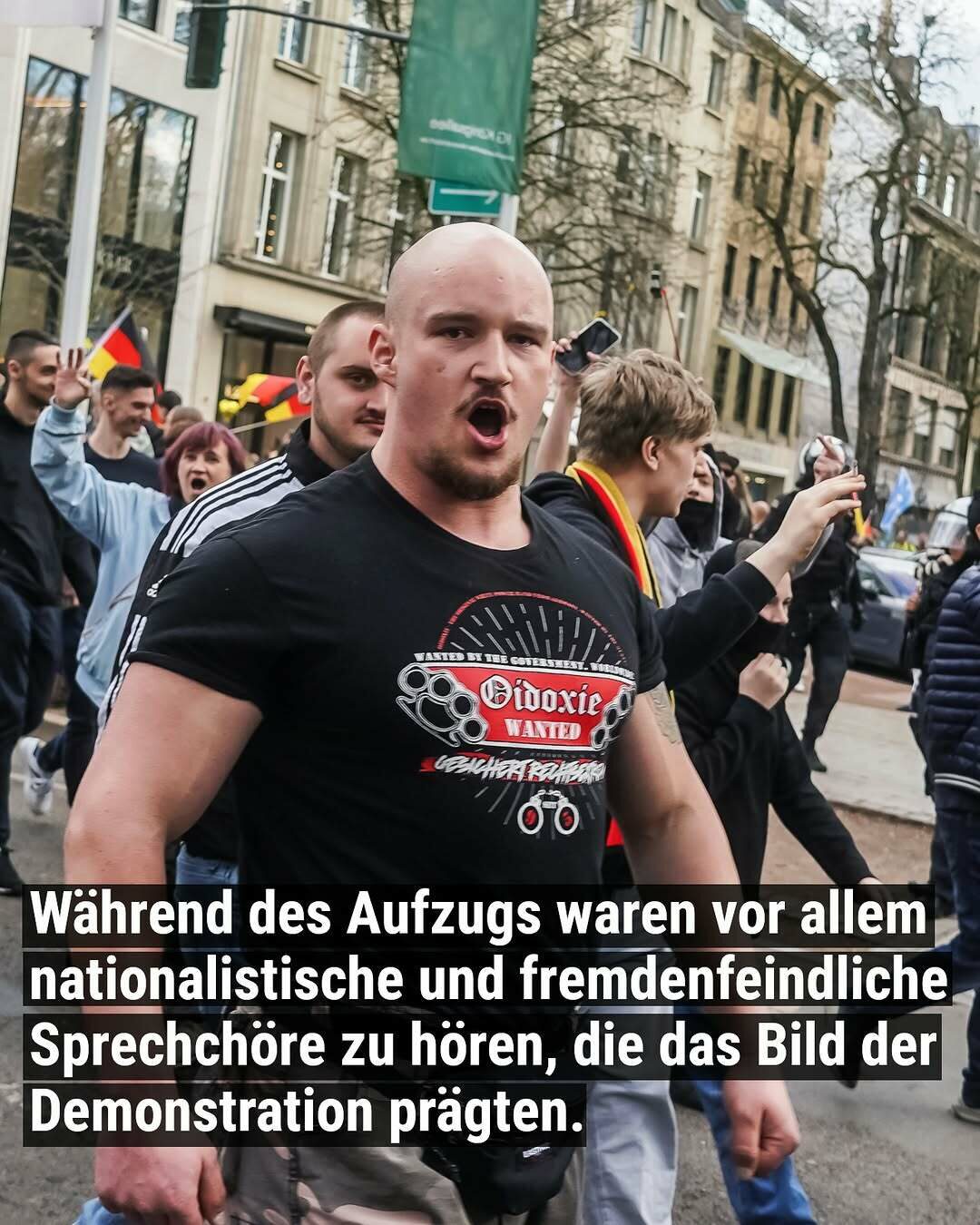 Daneben ließen sich einzelne Alt-Neonazis, Mitglieder der Identitären-Regionalgruppe „Reconquista 21“ oder bekanntere Reichsbürger*innen in Stuttgart blicken.