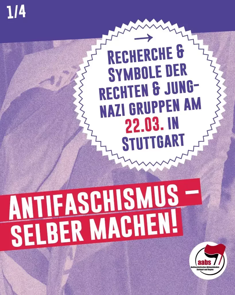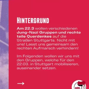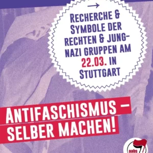 Das organisierte und militante Auftreten der Rechten und bewusste Rekrutieren von Jugendlichen wird sich weiter fortsetzen, so zum Beispiel diesen Samstag in Stuttgart. Das werden wir nicht ohne Widerstand zulassen! Als AABS rufen wir – als Teil vom Bündnis Stuttgart gegen Rechts gemeinsam mit weiteren lokalen und regionalen Gruppen – dazu auf, sich dem rechten Aufmarsch am Samstag massenhaft entgegenzustellen!