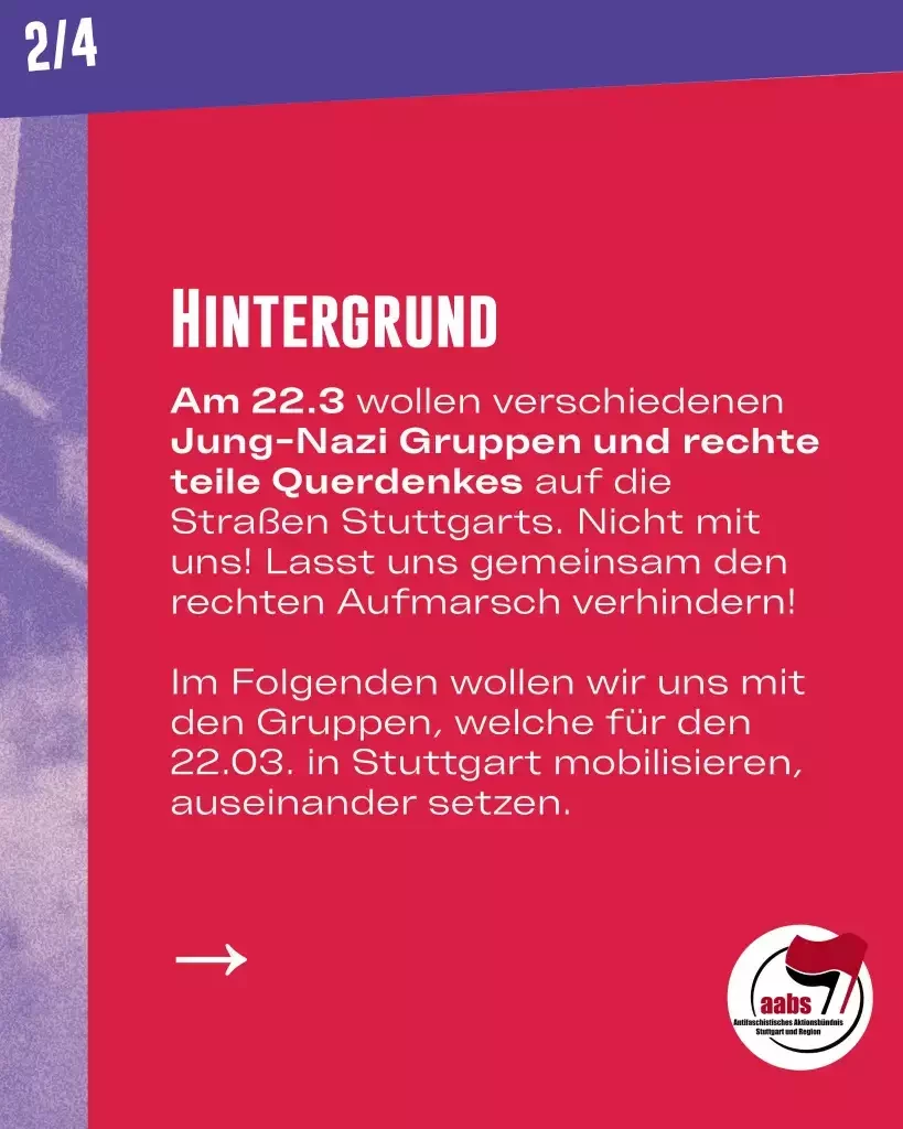 Am 22.3 wollen verschiedene jung Nazi-Gruppen und rechte Teile Querdenkens auf die Straßen Stuttgarts. Nicht mit uns – lasst uns gemeinsam den rechten Aufmarsch verhindern! Im Folgenden wollen wir uns mit der Entwicklung der Jugendgruppen und im Detail mit einigen der mobilisierenden Gruppen auseinandersetzen.