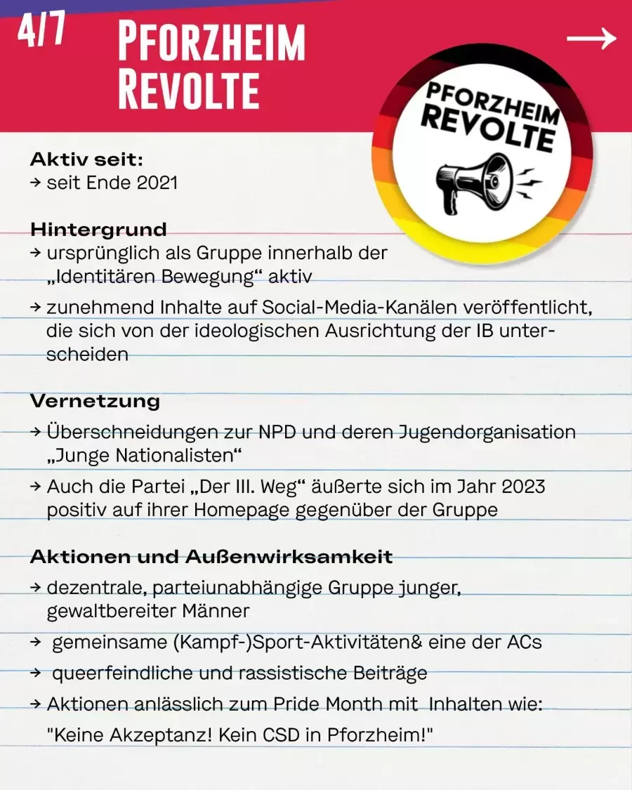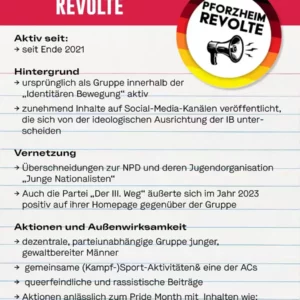 Eine von der IB veröffentlichte Übersichtskarte zeigte sie als Untergliederung. In den letzten Monaten wurde jedoch auf den Social-Media-Kanälen der Gruppe festgestellt, dass Pforzheim Revolte zunehmend Inhalte veröffentlichte, die sich von der ideologischen Ausrichtung der IB unterscheiden und die einen Schulterschluss mit anderen rechtsextremen Gruppierungen nahelegten. Eine Kampagne namens „Gegengift“, die ihrerseits personelle Überschneidungen zur „Nationaldemokratischen Partei Deutschlands“ (NPD) und deren Jugendorganisation „Junge Nationalisten“ aufweist, wurde daher bereits mehrfach von der Gruppe verbreitet. Auch die Partei „Der III. Weg“ äußerte sich im Jahr 2023 positiv auf ihrer Homepage gegenüber der rechtsextremistischen Gruppe „Pforzheim Revolte“. Ein richtiger Bruch mit der IB lässt sich aber nicht ausmachen – es scheint vielmehr, als würden die Grenzen zunehmend verschwimmen.