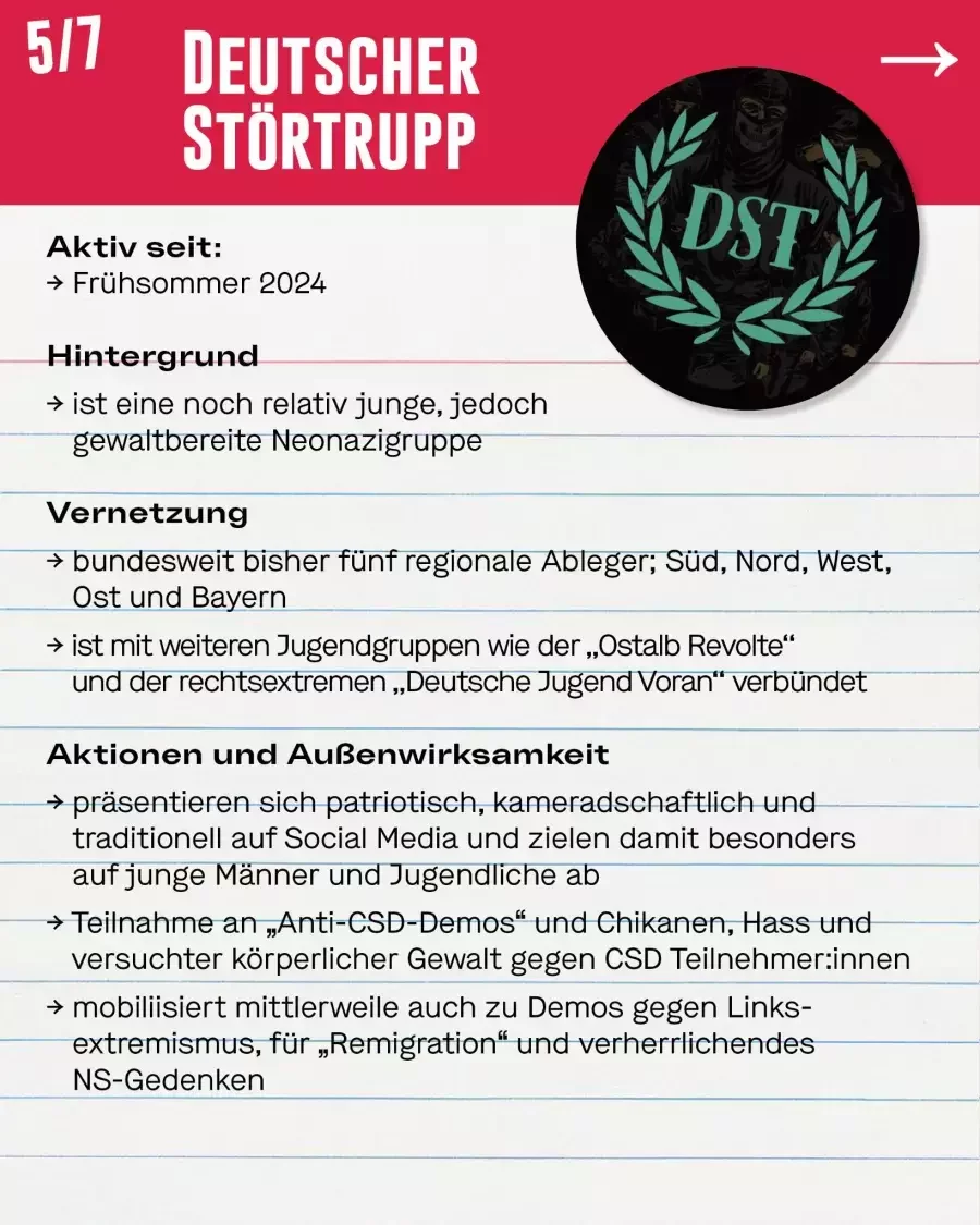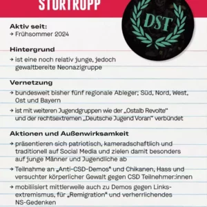 Der Störtrupp (DST) ist eine noch relativ junge, jedoch gewaltbereite Neonazigruppe, die seit dem Frühsommer 2024 aktiv ist. DST hat bundesweit bisher fünf regionale Ableger: Süd, Nord, West, Ost und Bayern und ist mit weiteren Jugendgruppen wie der Ostalb Revolte und der rechtsextremen DJV verbündet. Auf ihren Social Media Kanälen präsentieren sie sich als patriotisch, kameradschaftlich und traditionell und zielen damit besonders auf junge Männer und Jugendliche ab. Im vergangenen Jahr fiel die Gruppe vor allem durch die Teilnahme an „Anti-CSD-Demos“ auf, bei denen DST nicht vor Schikane, Hass und versuchter körperlicher Gewalt gegen CSD Teilnehmer:innen zurückschreckt. Mittlerweile mobilisiert DST allerdings auch zu Demos gegen „Linksextremismus“, für “Remigration” und verherrlichendes “NS-Gedenken”. Als junge faschistische Gruppierung sind sie Teil der neuen Generation von Neonazis, die noch nicht fest in der Neonazi-Szene etabliert sind, jedoch bereits mit dem III. Weg, der Partei „Die Heimat“ (ehem. NPD) und den Jungen Nationalisten (JN) auf Demos unterwegs sind. Zwar ist das Polizeiaufgebot auf den Demos immens, ein Einschreiten der Cops findet allerdings nur dann statt, wenn es zu körperlichen Angriffen kommt. Somit wird es DST möglich, ihre rassistische, queerfeindliche und menschenverachtende Propaganda auf die Straßen zu tragen.