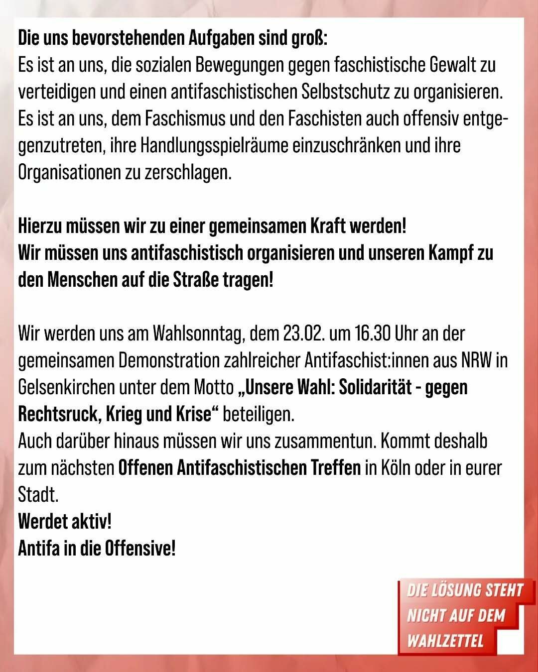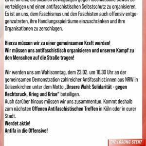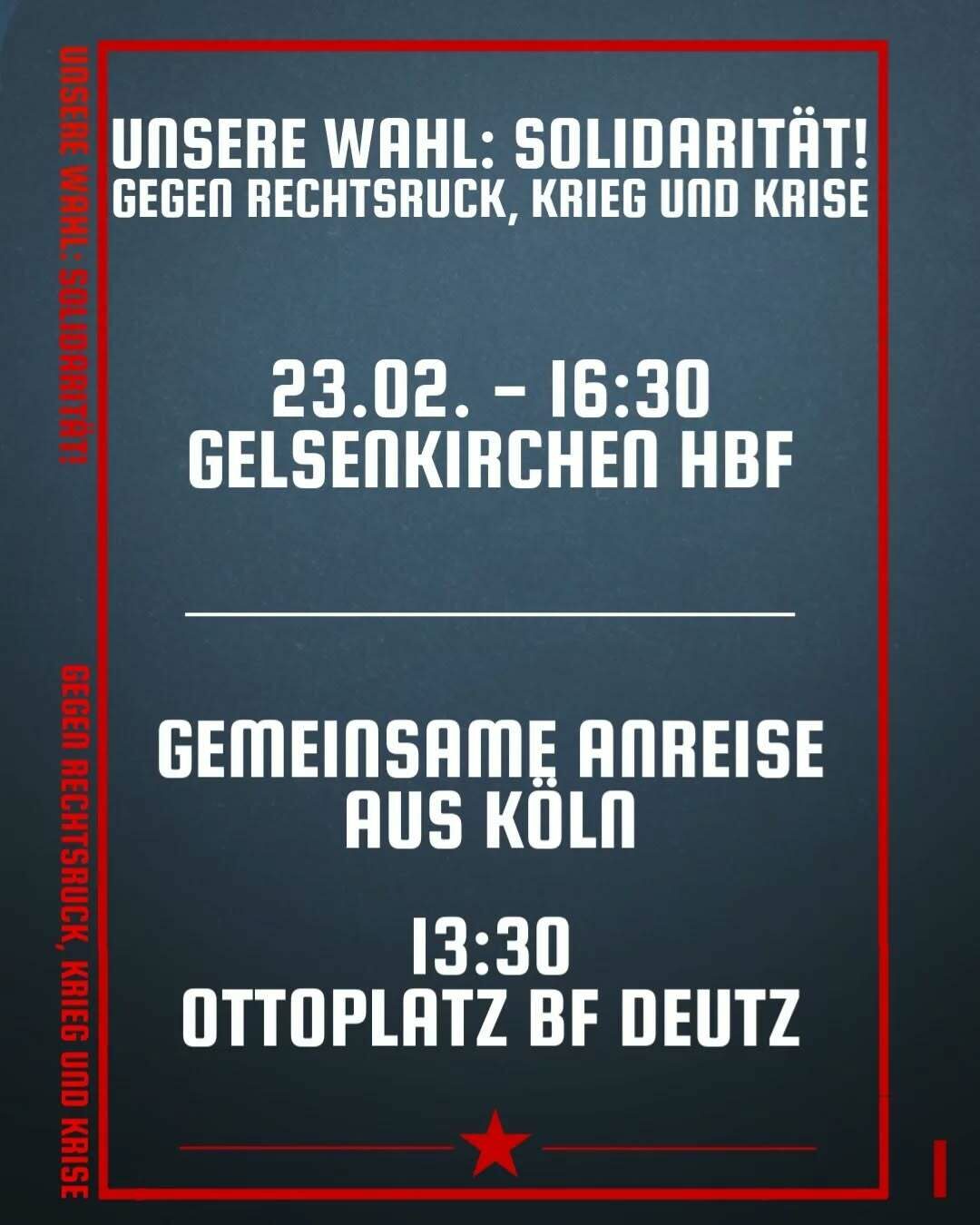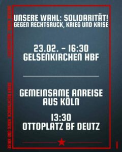 Wir werden uns am Wahlsonntag, dem 23.02. um 16.30 Uhr an der gemeinsamen Demonstration zahlreicher Antifaschist:innen aus NRW in Gelsenkirchen unter dem Motto „Unsere Wahl: Solidarität – gegen Rechtsruck, Krieg und Krise“ beteiligen.