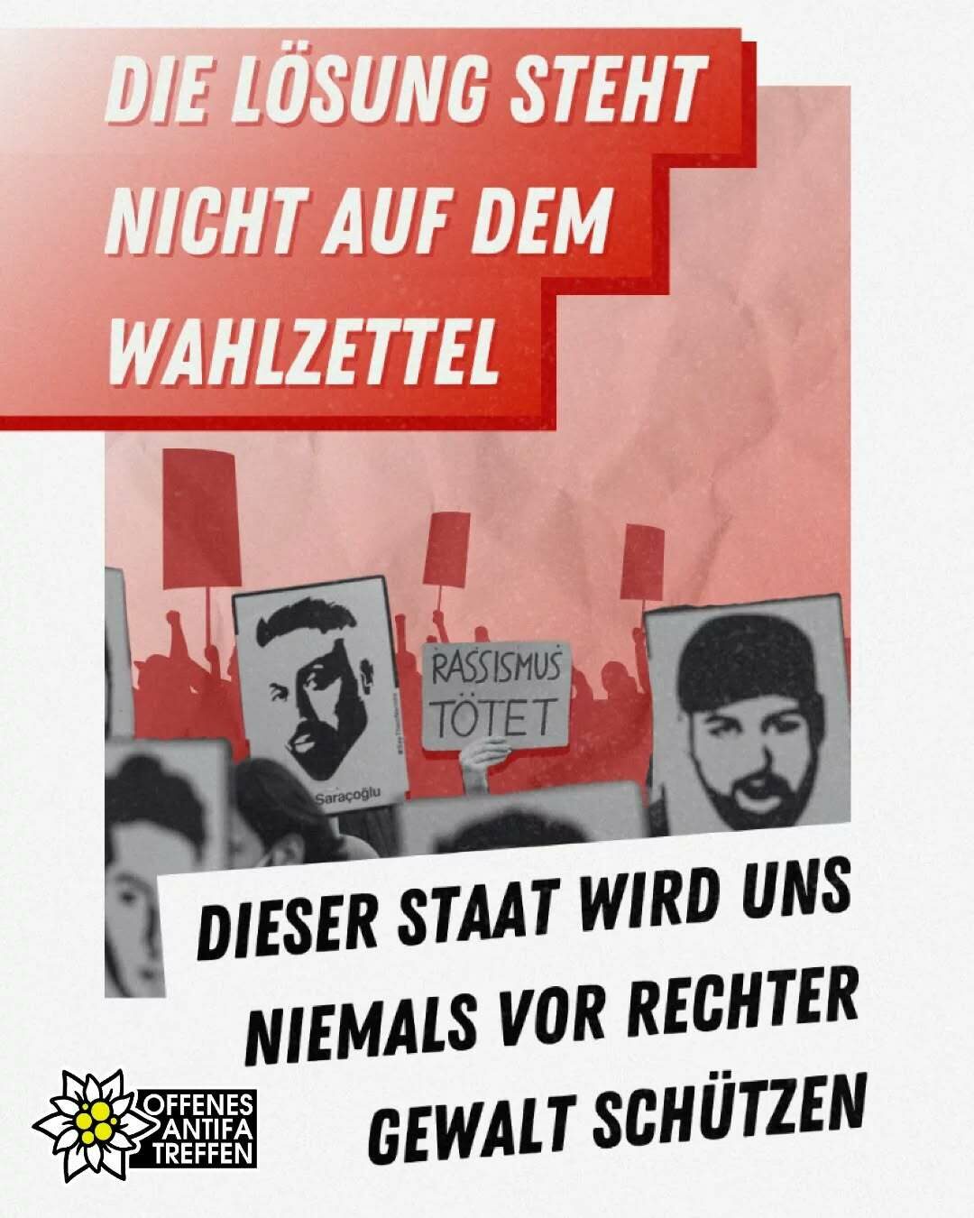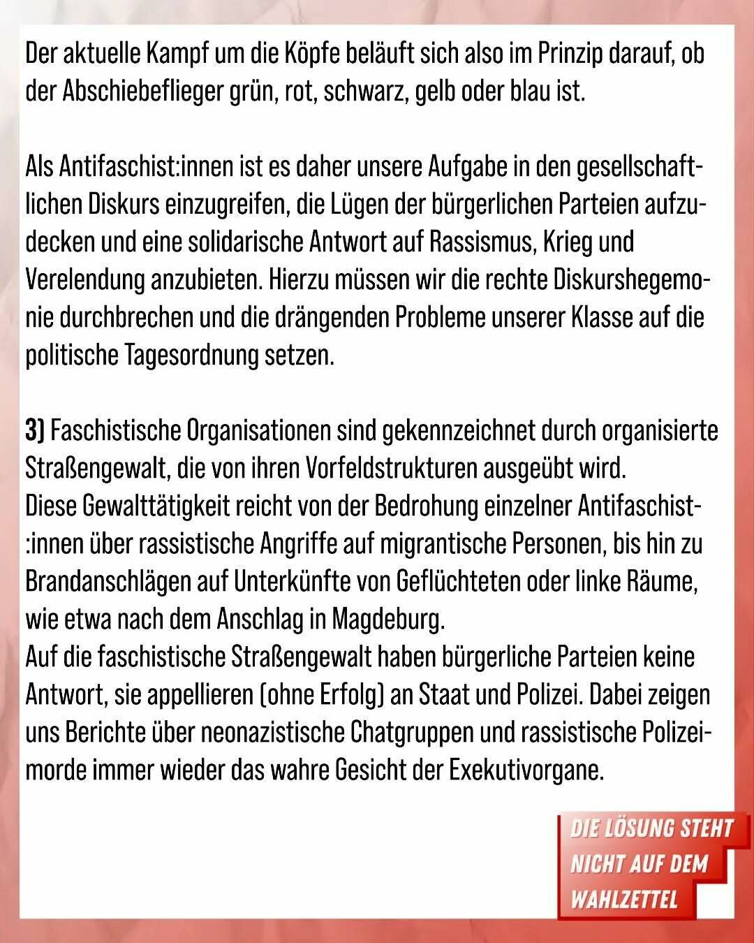 Unsere Zukunft wird nicht an der Wahlurne oder im Parlament erkämpft, sondern auf der Straße. Geeint, organisiert und solidarisch werden wir die Gegenmacht von unten aufbauen und diesem System den Kampf ansagen!