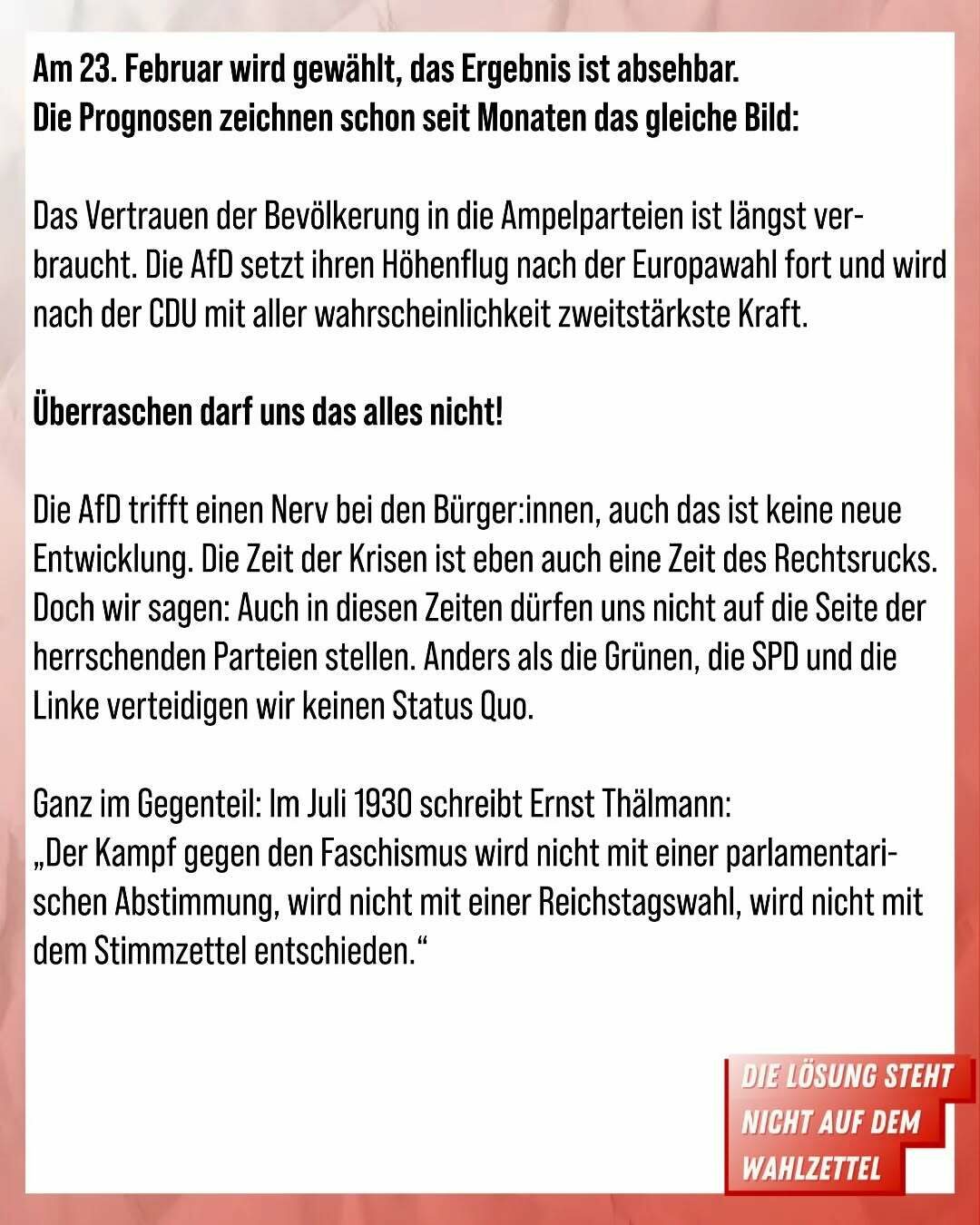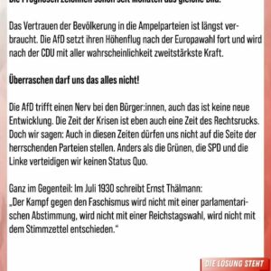 Die AfD trifft einen Nerv bei den Bürger:innen, auch das ist keine neue Entwicklung. Die Zeit der Krisen ist eben auch eine Zeit des Rechtsrucks. Doch wir sagen: Auch in diesen Zeiten dürfen uns nicht auf die Seite der herrschenden Parteien stellen. Anders als die Grünen, die SPD und die Linke verteidigen wir keinen Status Quo.